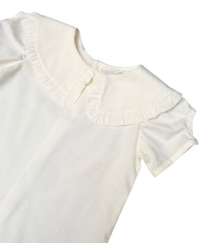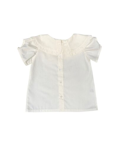 Bata Aurora manga curta, com botões nas costas e abertura na manga. Possui gola babado.