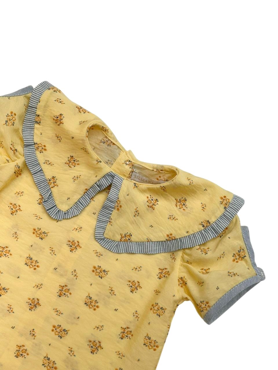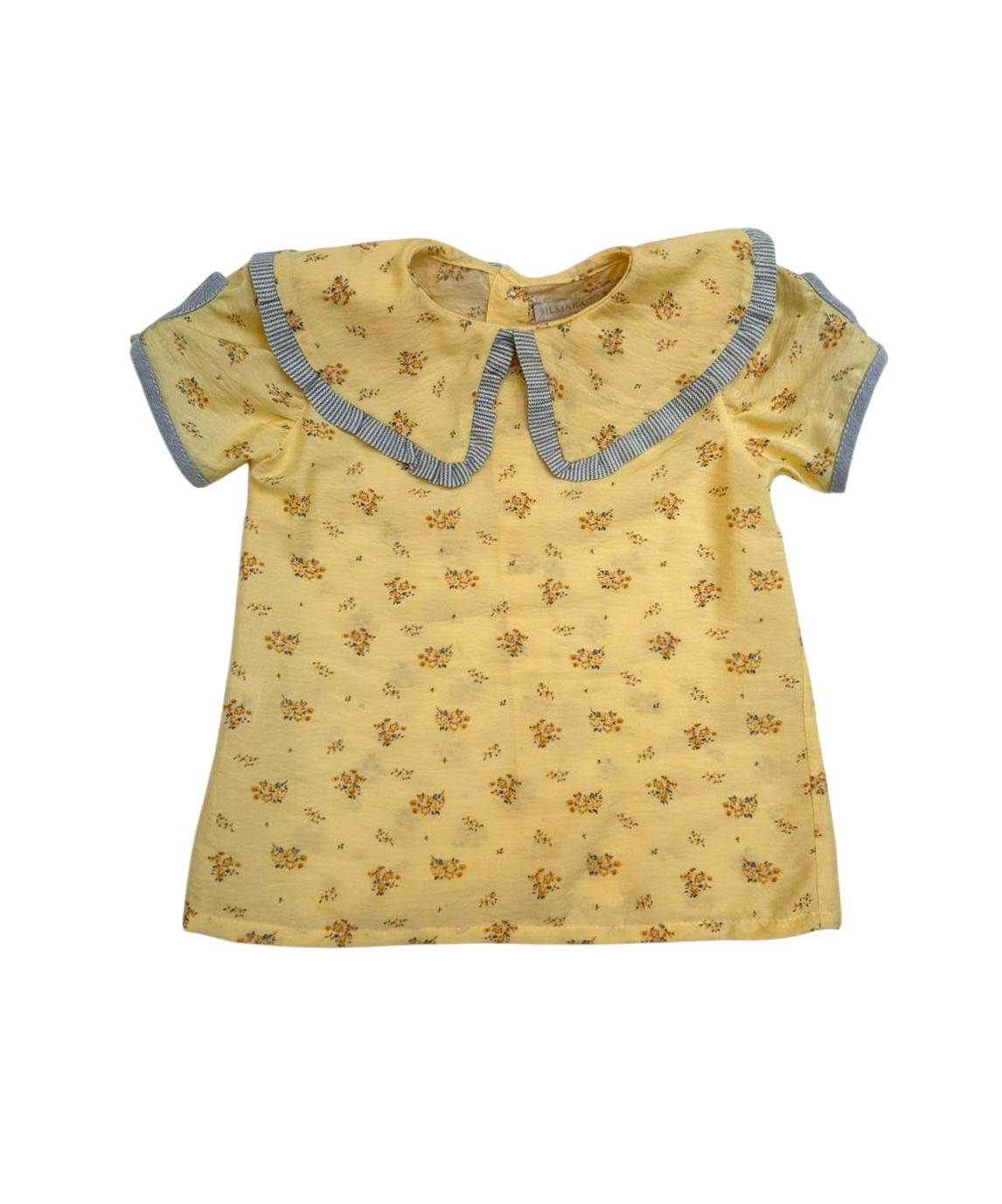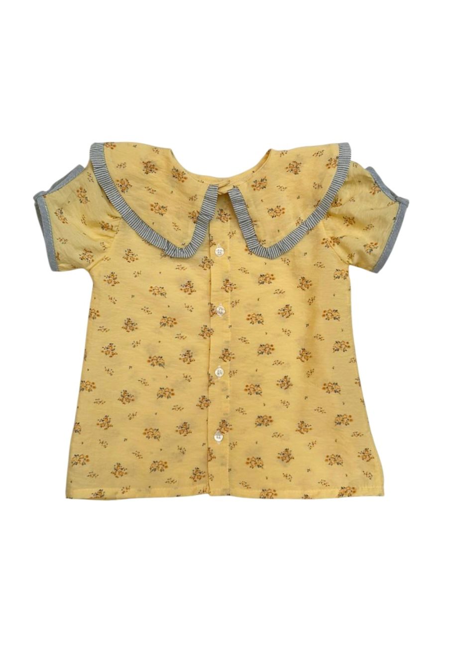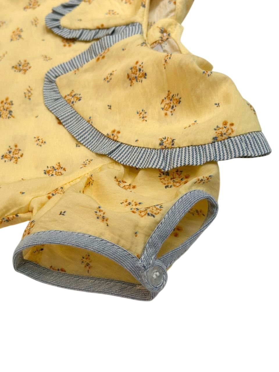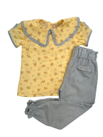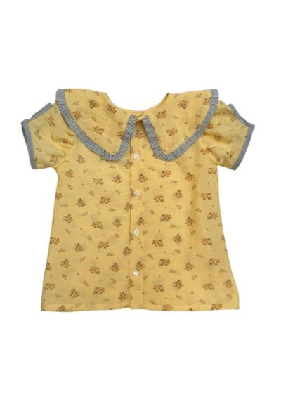 Bata Aurora, possui gola com babado na barra em tecido listrado, botões de fechamento nas costas e detalhe na manga.