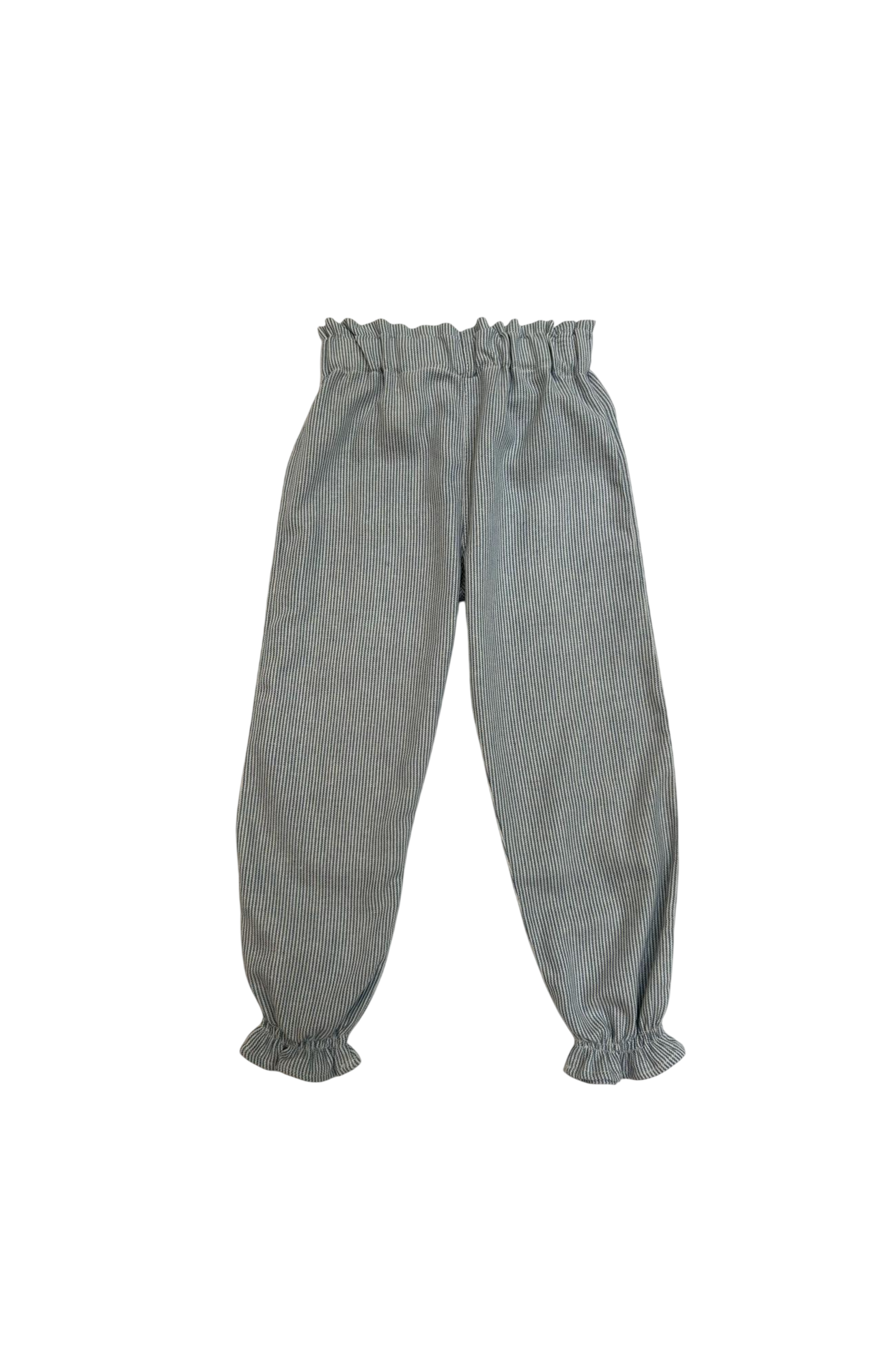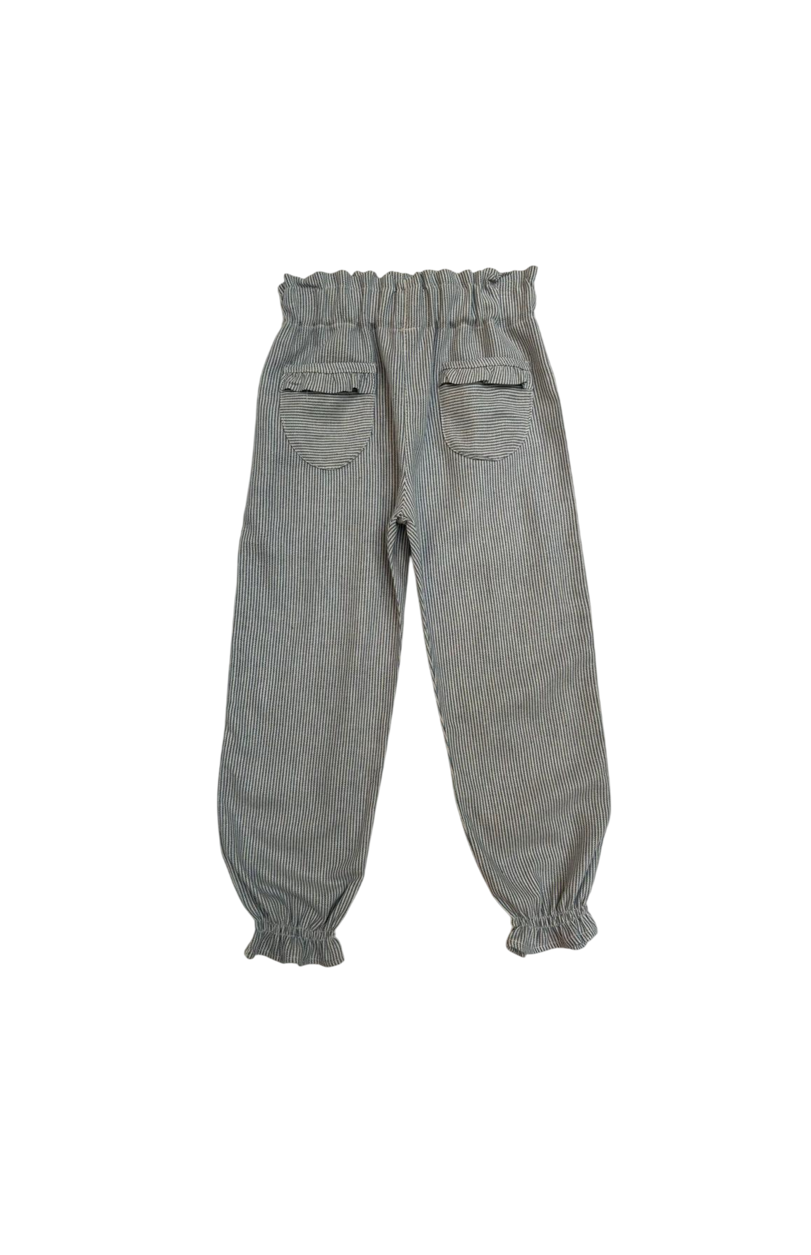 Calça possui bolsos na frente com babados, elástico na cintura e lastex na barra.