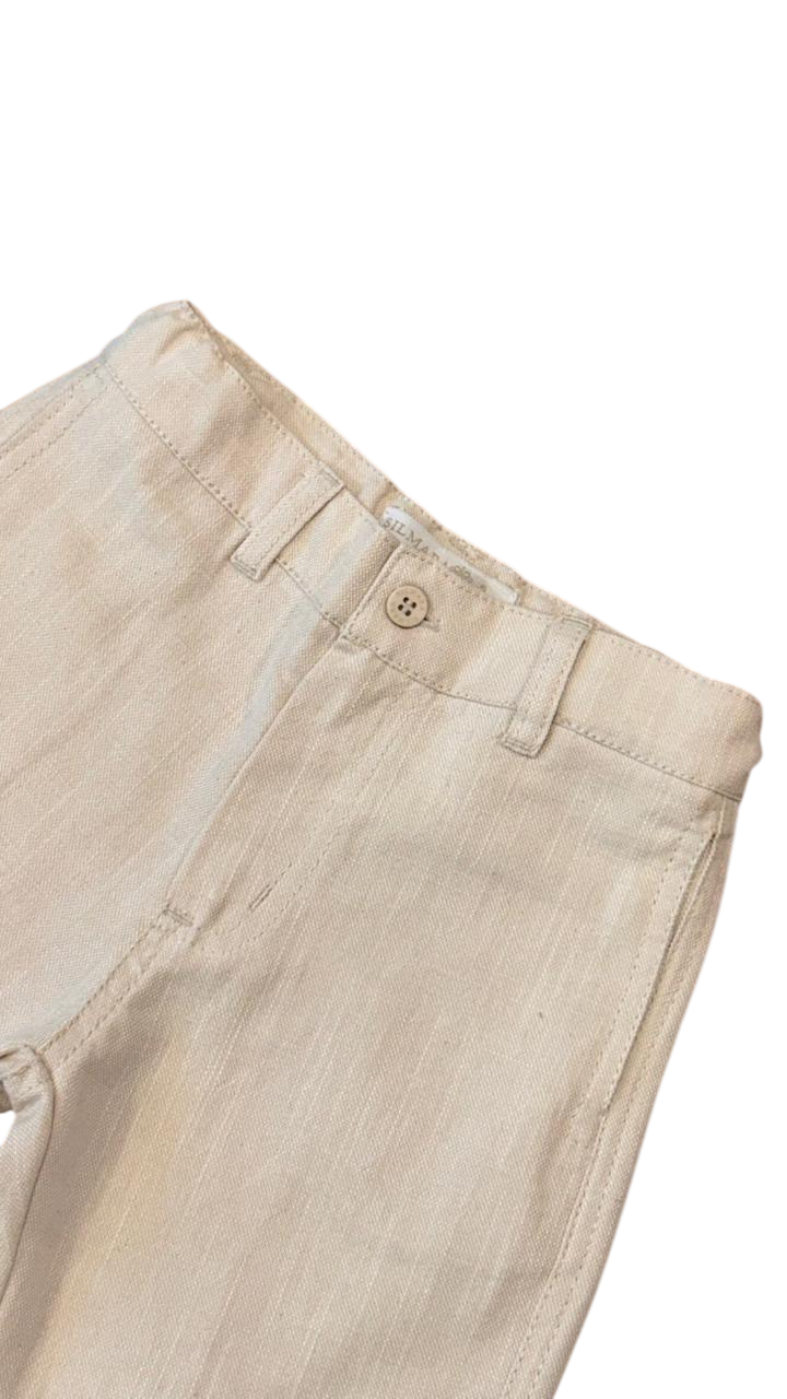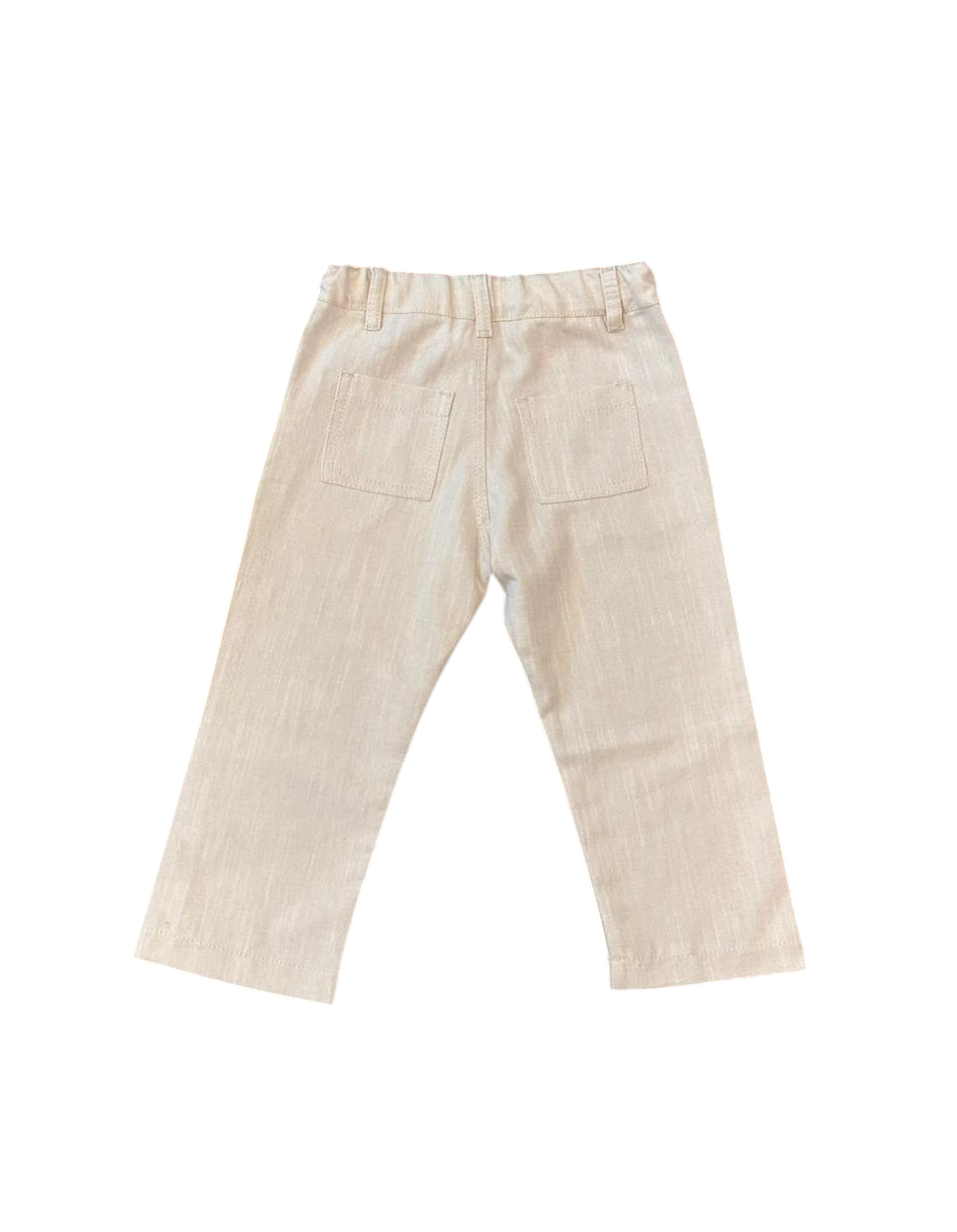 Calça com bolso quadrado atrás, elástico de ajuste na cintura, botão e zíper para fechamento na frente.