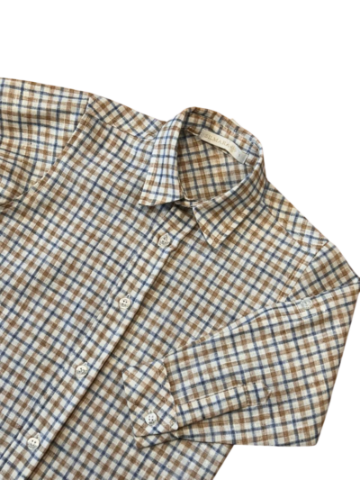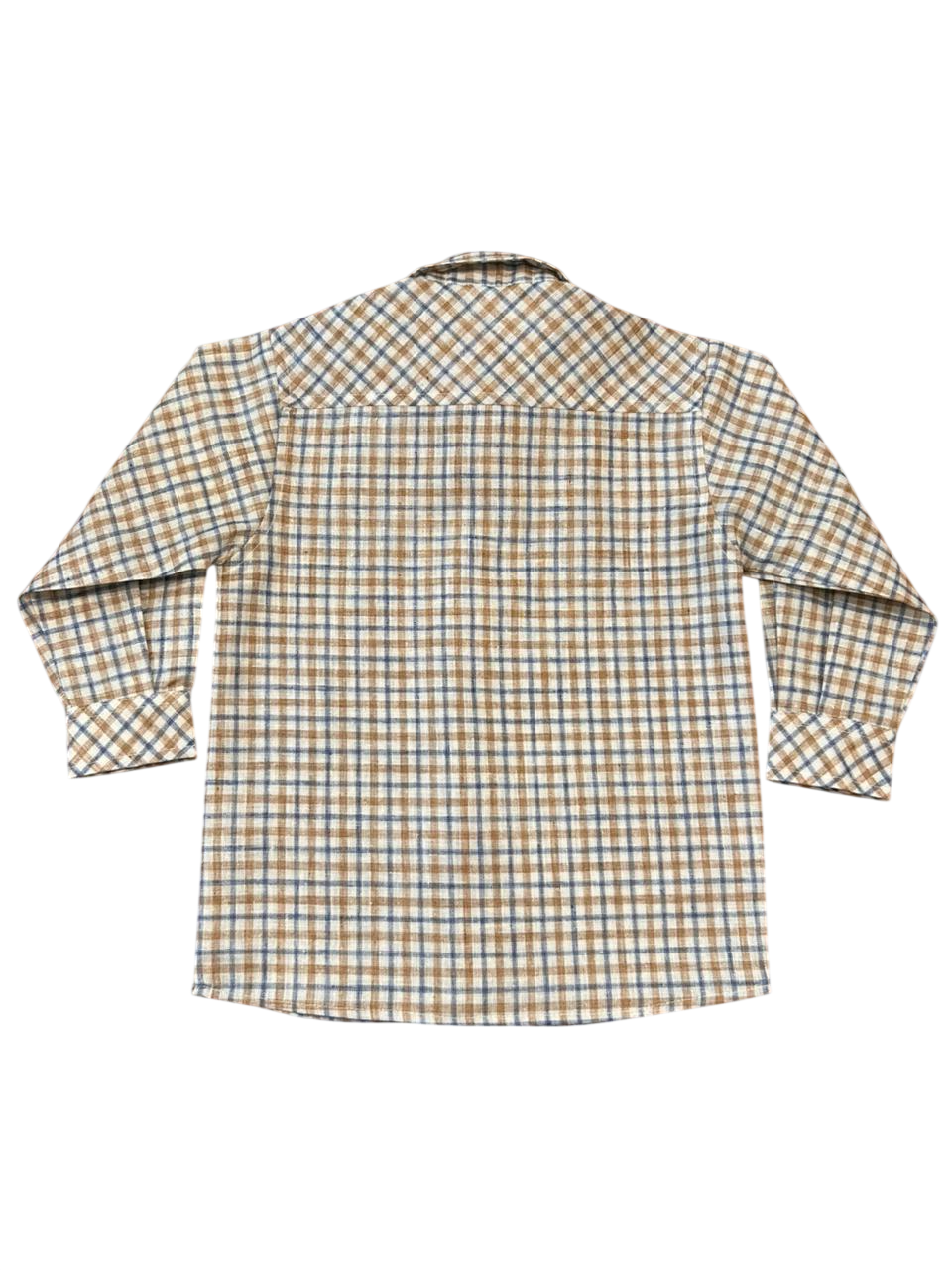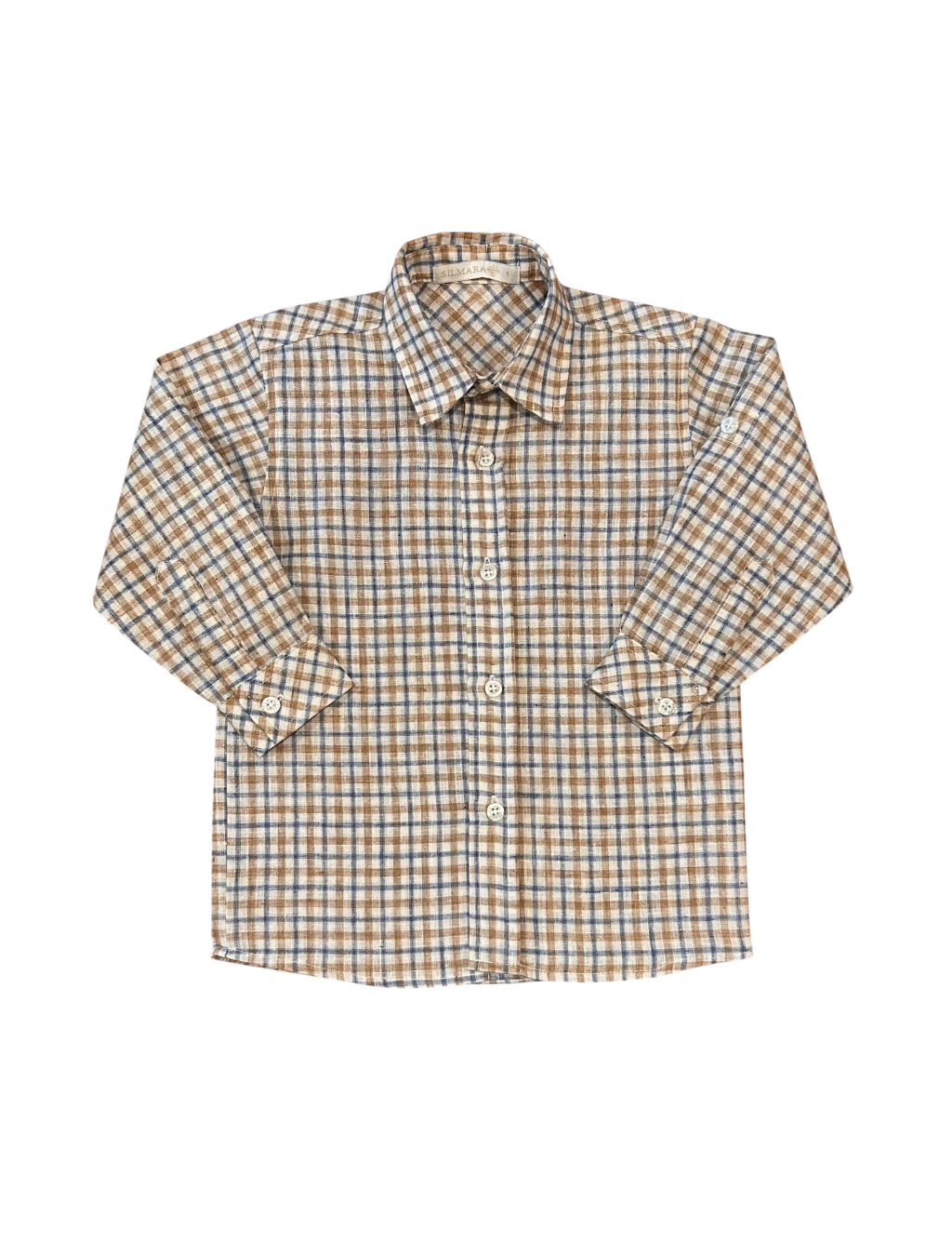 Camisa básica em tecido xadrex, possui gola bico, botões na frente para fechamento e martingale na manga.