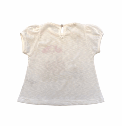 camiseta com manga bufante com gola redonda e recorte em forma de gota com botão de pressão. 100% algodão.