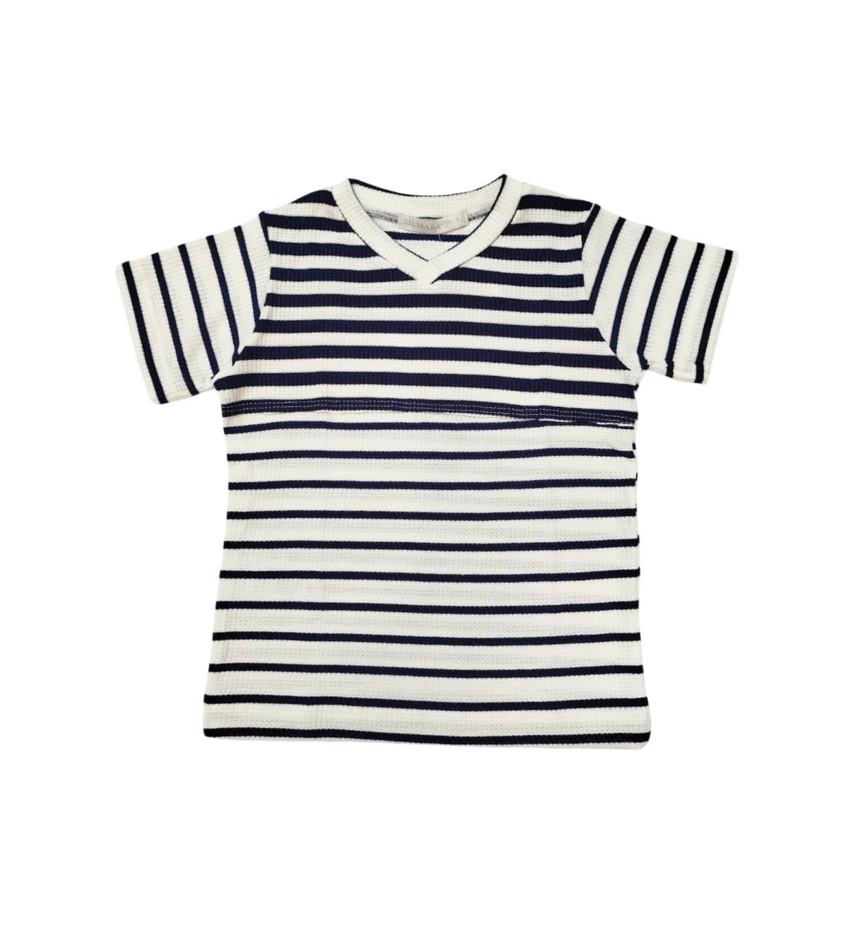 Camiseta Listrada gola v, possui detalhe no peito com listras mais grossas.