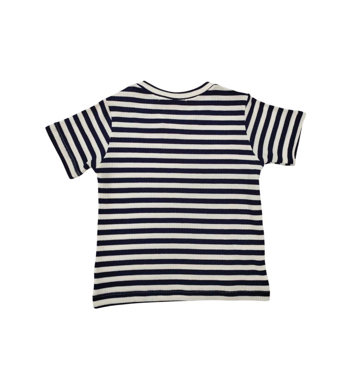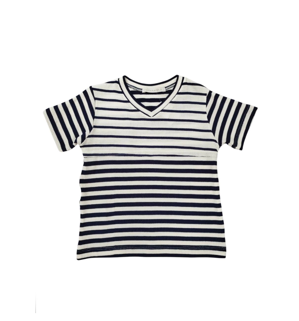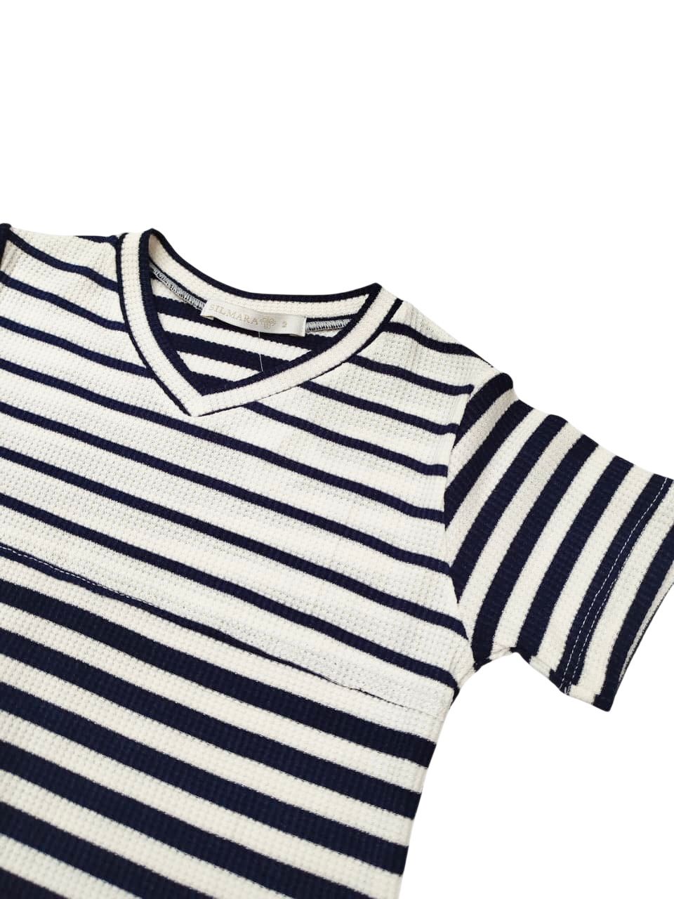 Camiseta Pedro listrada, possui gola v e tecido com listras mais finas na altura do peito.