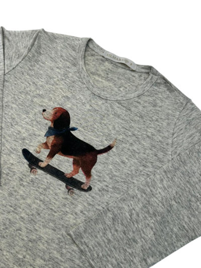Camiseta manga longa, com estampa de cachorro.