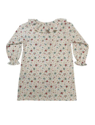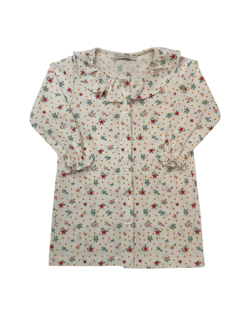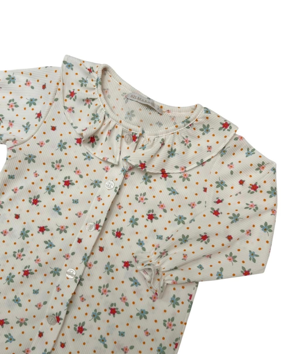 Camisola canelada em tecido estampado, possui botões na frente e babado na gola.