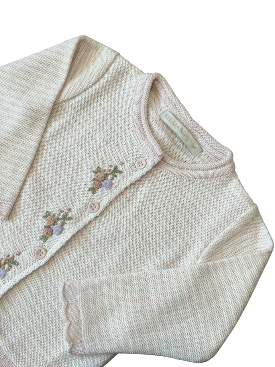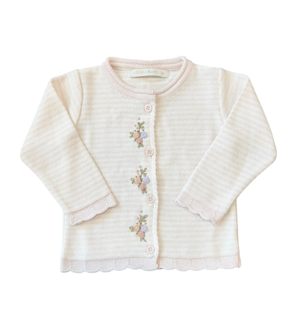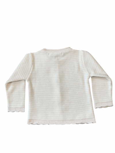 O cardigan tricot listrado possui bordado á mão na frente, fechamento com botões, punho e barra com detalhe em ondas.