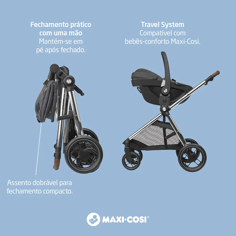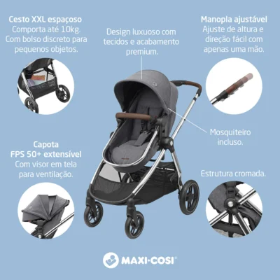 - Detalhes luxuosos com os tecidos premium, bordado e anel metalizado com a marca Maxi-Cosi