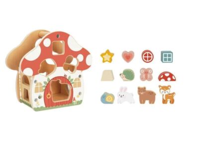 Esta charmosa Casinha Cogumelo é um brinquedo de encaixe e formas, projetado em um adorável formato de cogumelo, sendo um convite à descoberta para os pequenos.