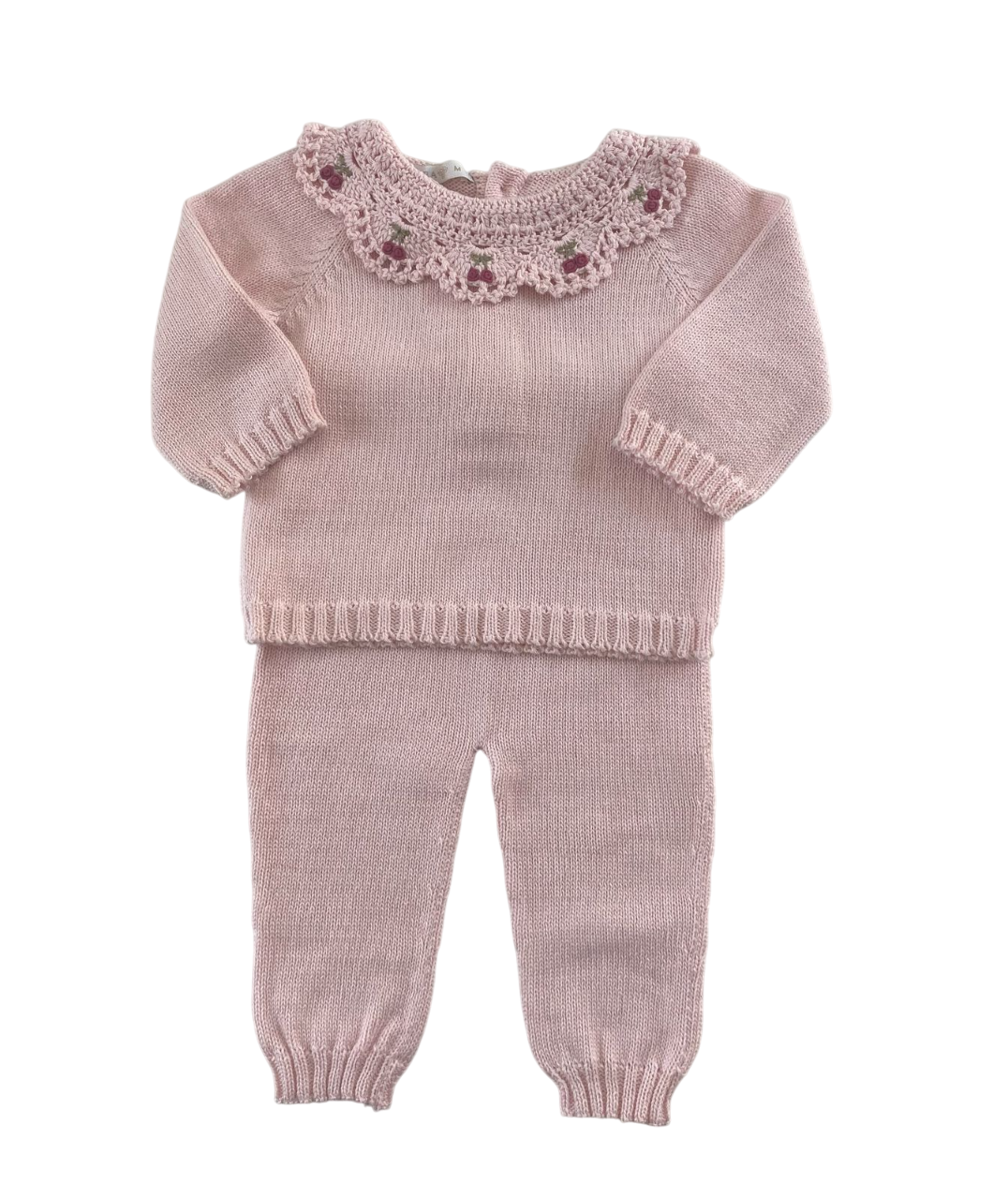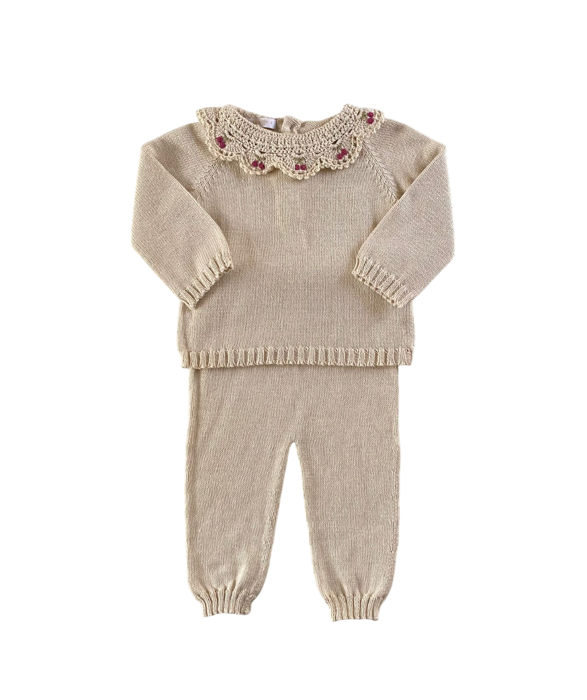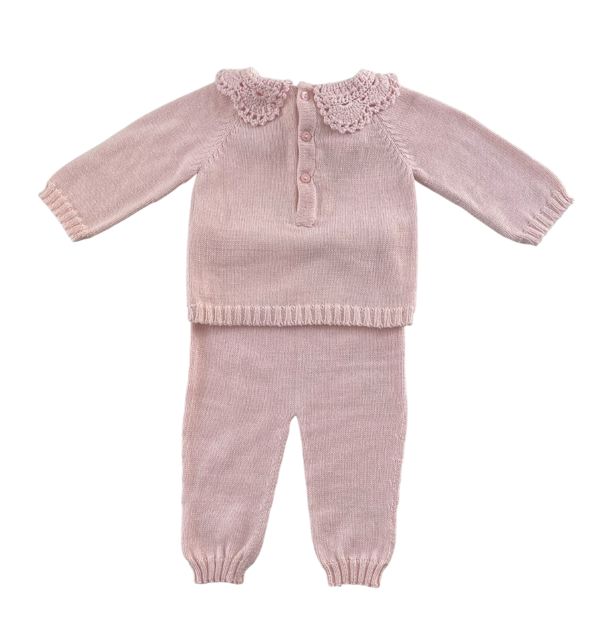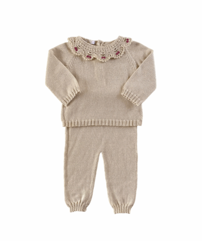 Conjunto duas peças feito em tricot com gola crochet. 50% algodão e 50% acrilíco.