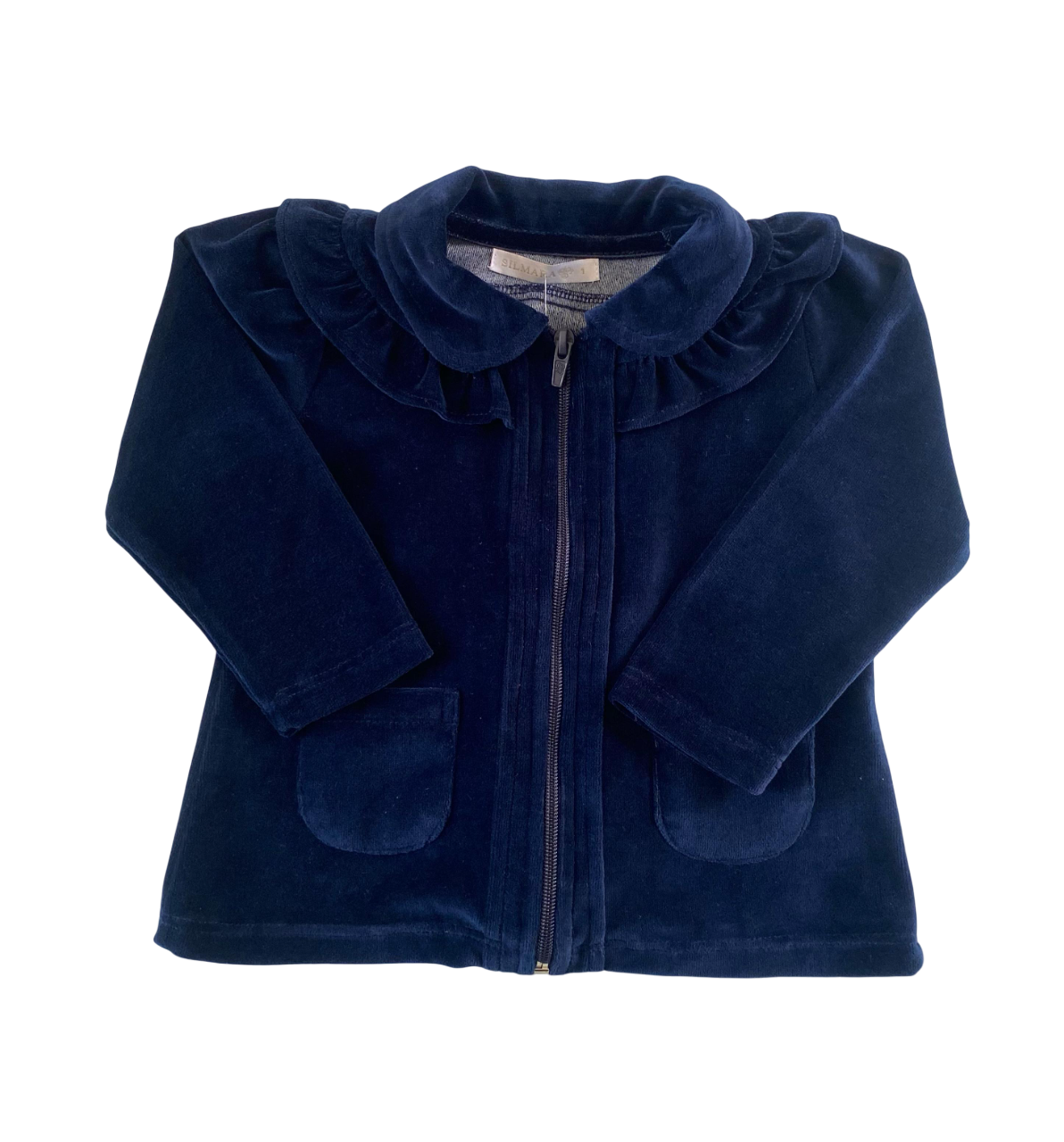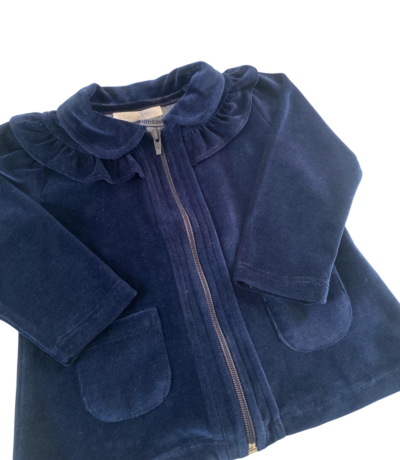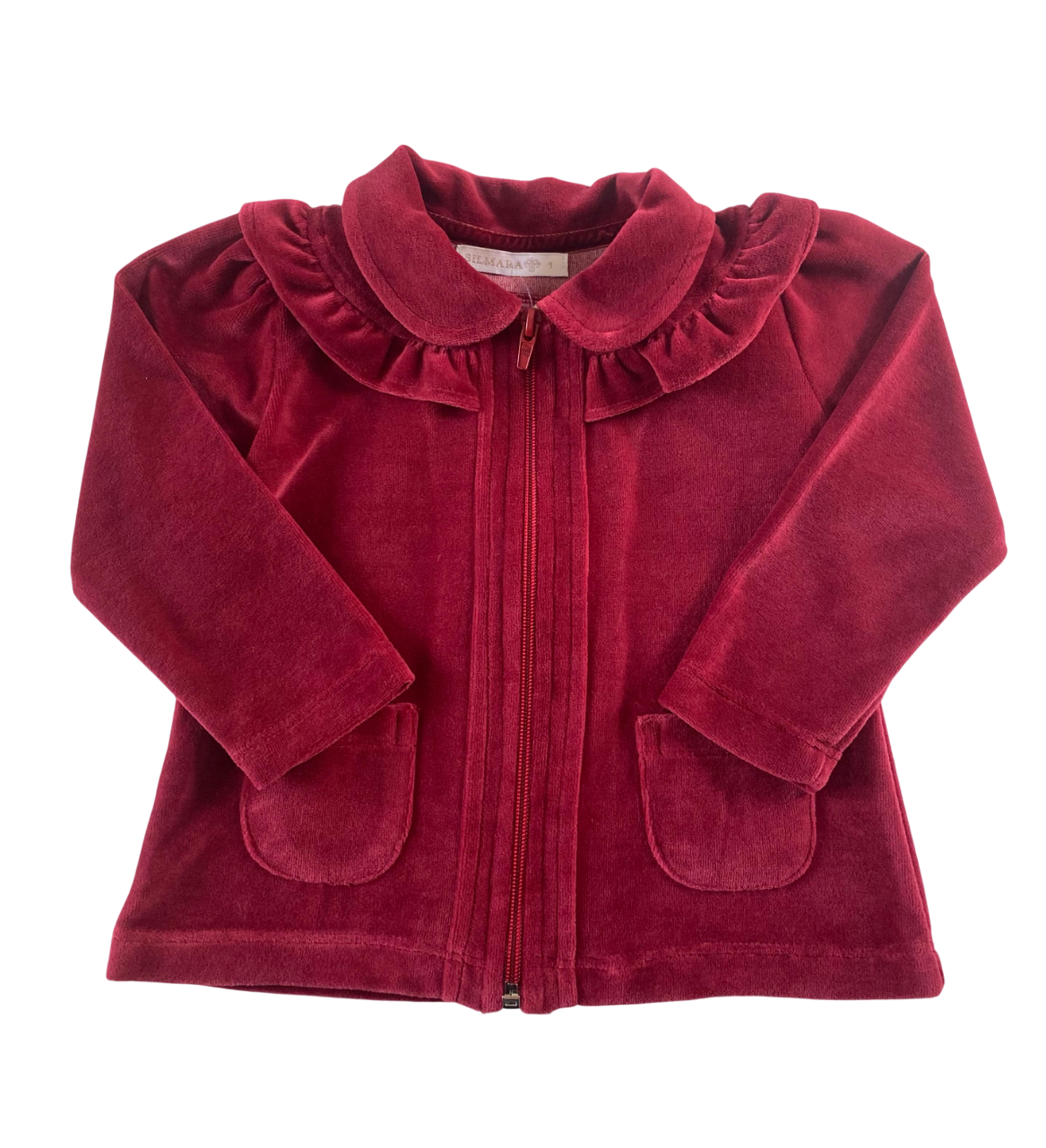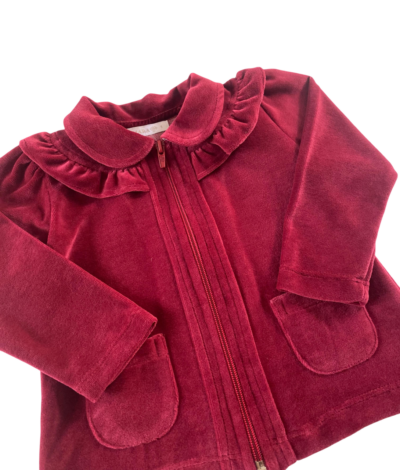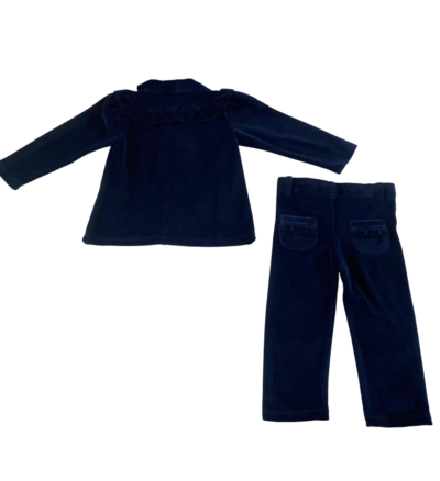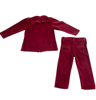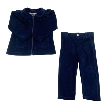 Conjunto de plush com babadinhos e detalhe lacinho, ziper para fecho no casaco e elástico para juste na cintura da calça. 82% algodão e 18% poliéster.