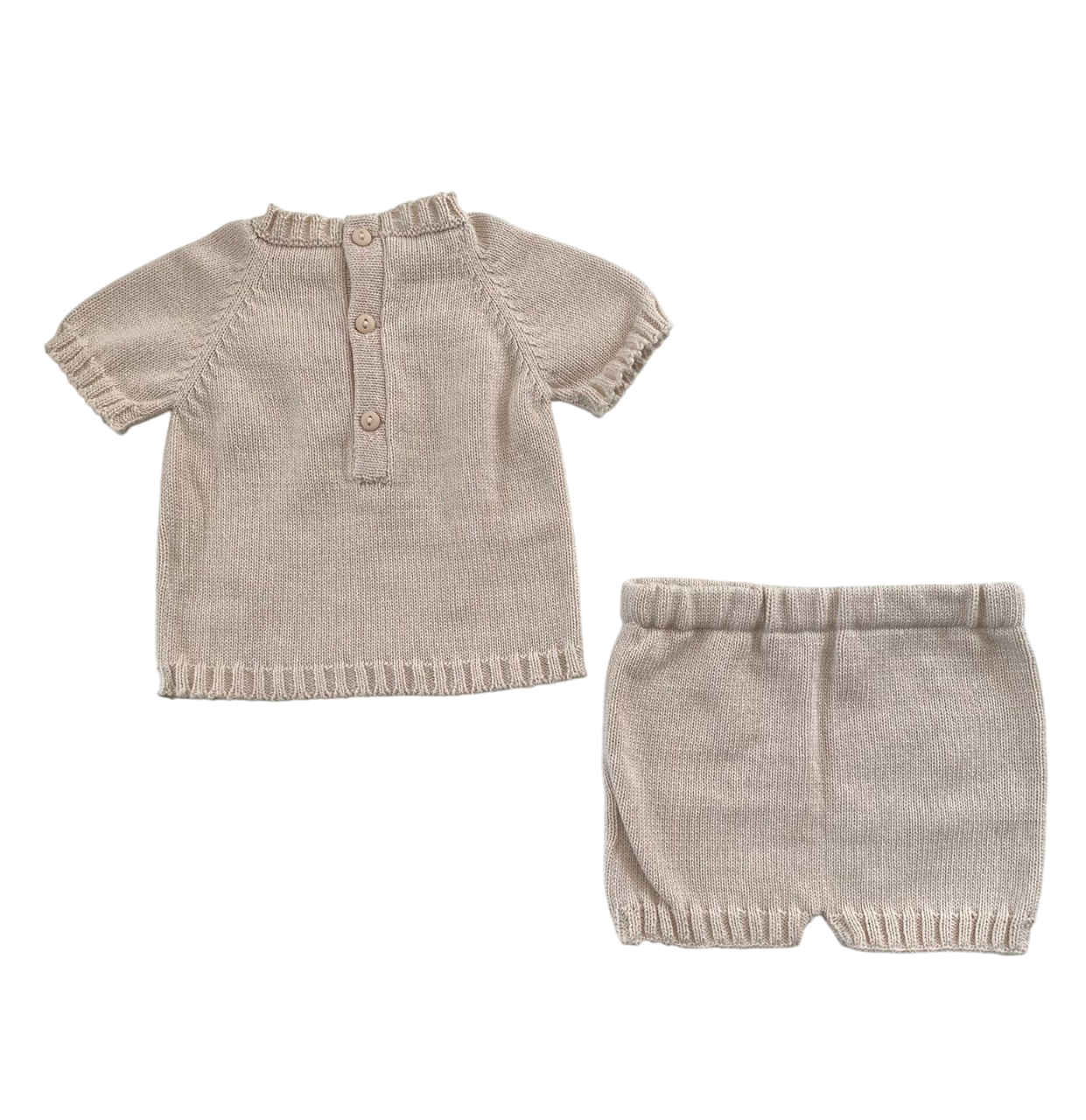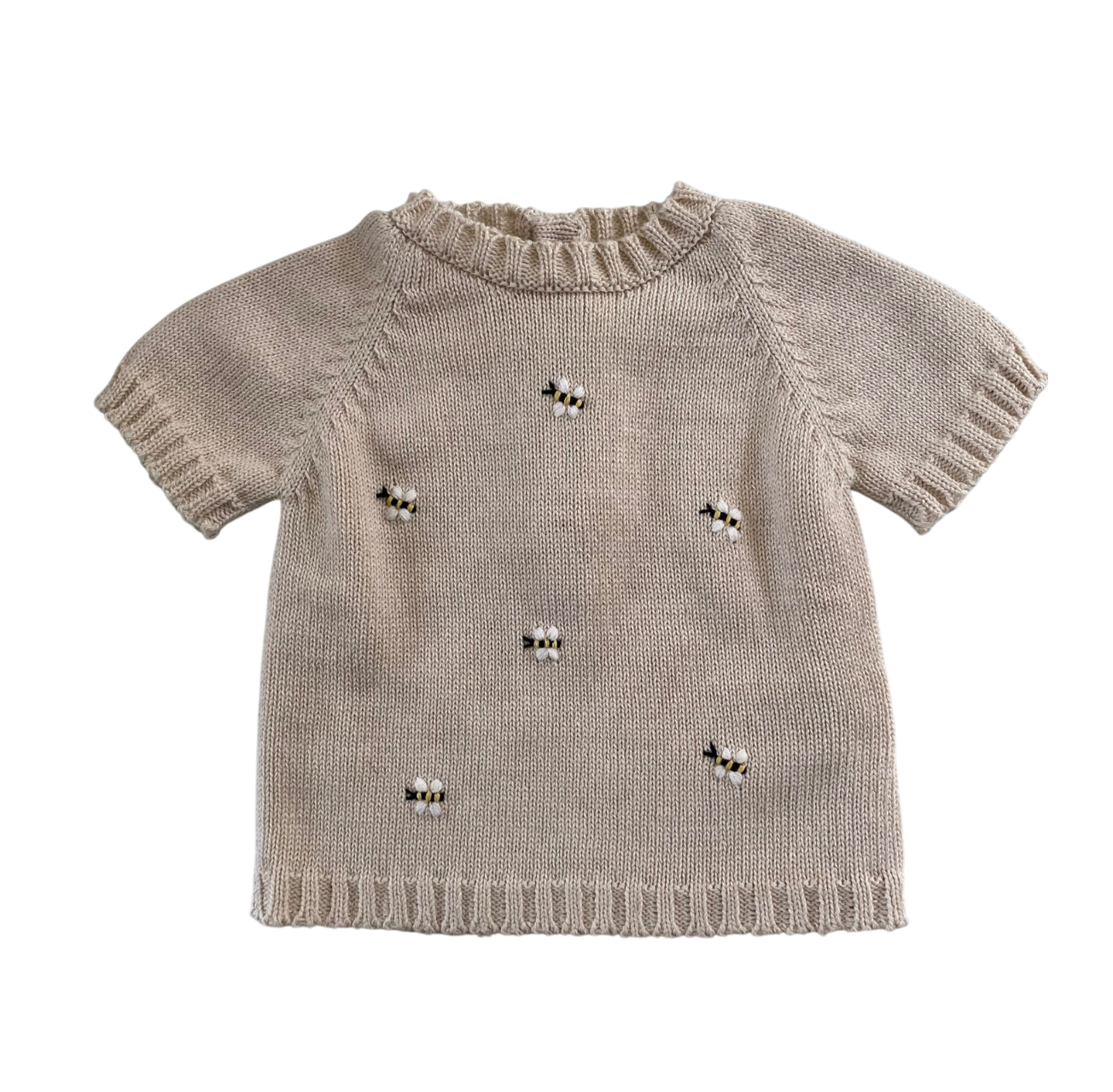 Conjunto feito em tricot com detalhe bordado de abelhas. 50% algodão e 50% acrilíco.