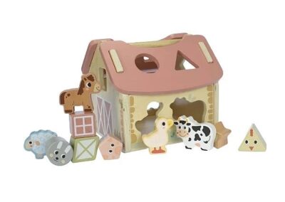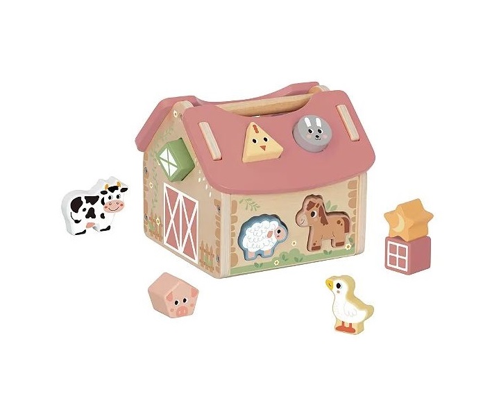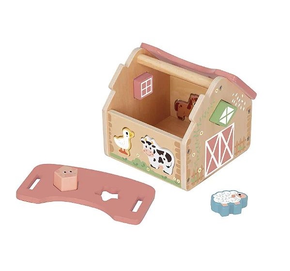 Encaixe Formas Casa Celeiro Fazendinha de madeira possui alguns tipos de animais fofos e diferentes formas de encaixe em blocos.