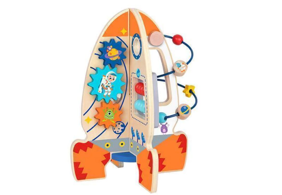 O foguete de atividades de madeira transportará nossas crianças para o espaço. O jogo é destinado a crianças com mais de 24 meses. A criança pode escolher entre uma variedade de atividades educativas divertidas. O foguete é feito com lindas cores, para chamar a atenção da criança, ajudando a desenvolver sua capacidade visual. Em cada lado do foguete existe uma atividade diferente, adequada para desenvolver habilidades como imaginação, lógica, memória e movimento.