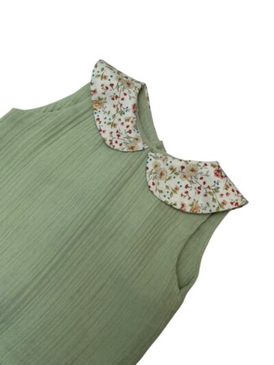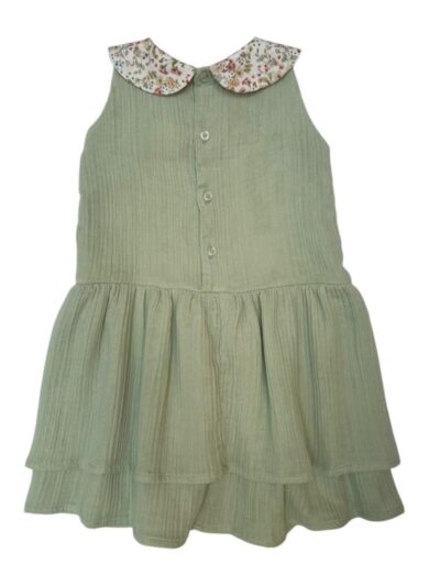 Vestido em tecido anarruga, com gola floral, possui botões nas costas e saia dupla.