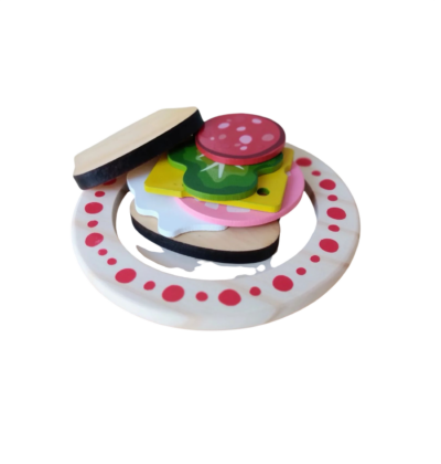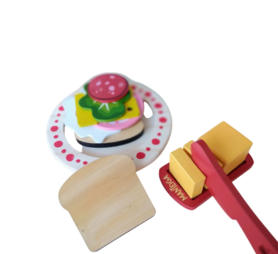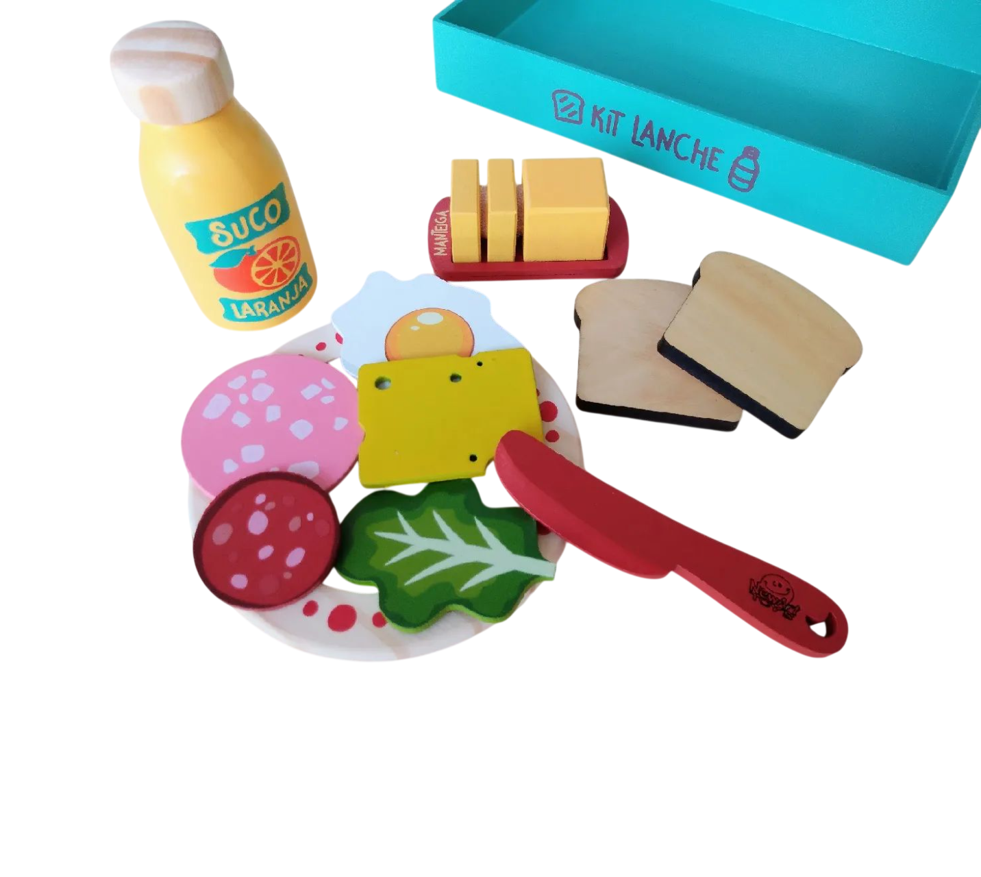 Conteúdo: este kit é composto por 14 peças (conforme imagem de fundo branco), sendo 1 prato, 1 faca, 3 pedaços de manteiga com velcro em 1 suporte, 1 frasco de suco, 2 fatias de pão, 1 ovo frito, 1 folha de alface, 1 fatia de queijo e 2 de frios.