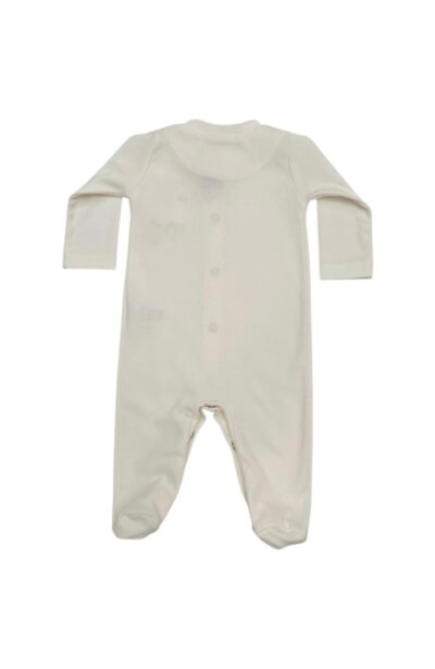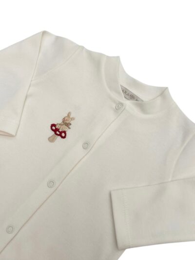 Macacão básico com bordado de coelho e cogumelo, possui botões na frente e entrepernas.