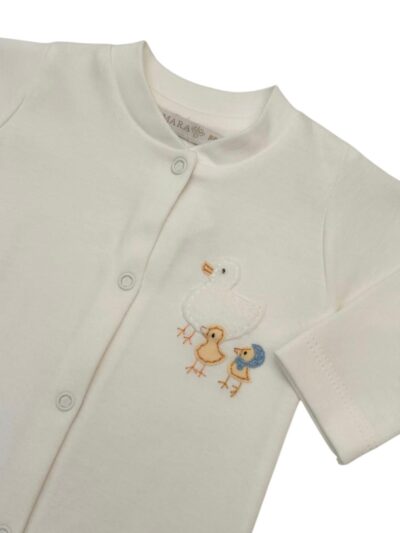 Macacão básico com bordado de patos, possui botões na frente e entrepernas.