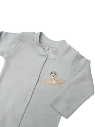 Macacão básico com bordado de urso, possui botões na frente e entrepernas.