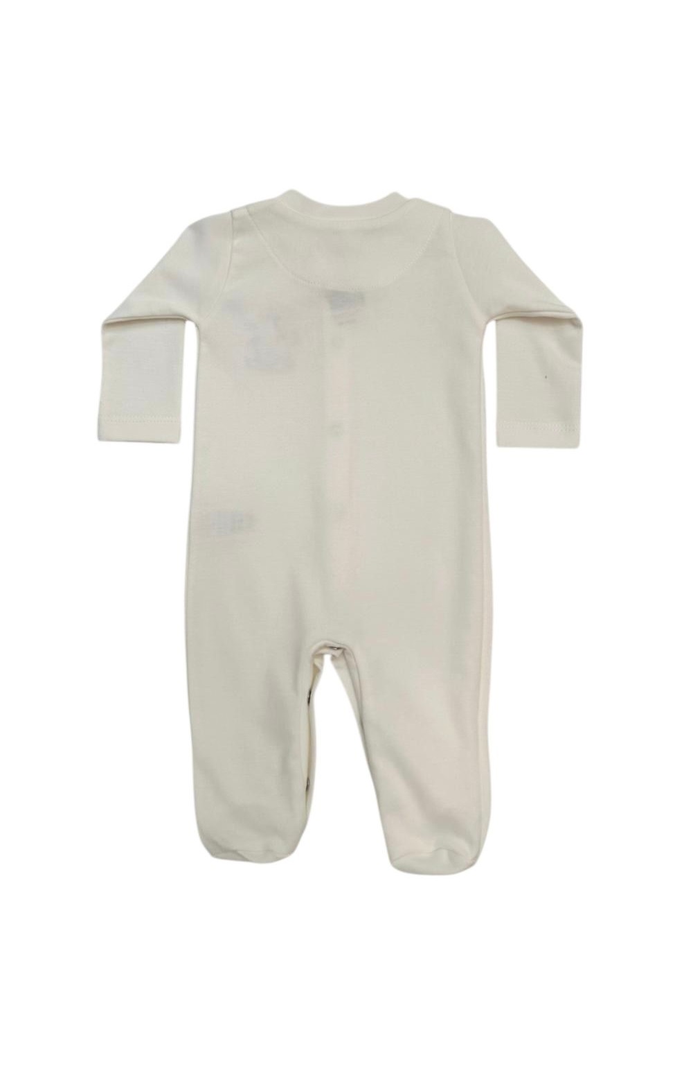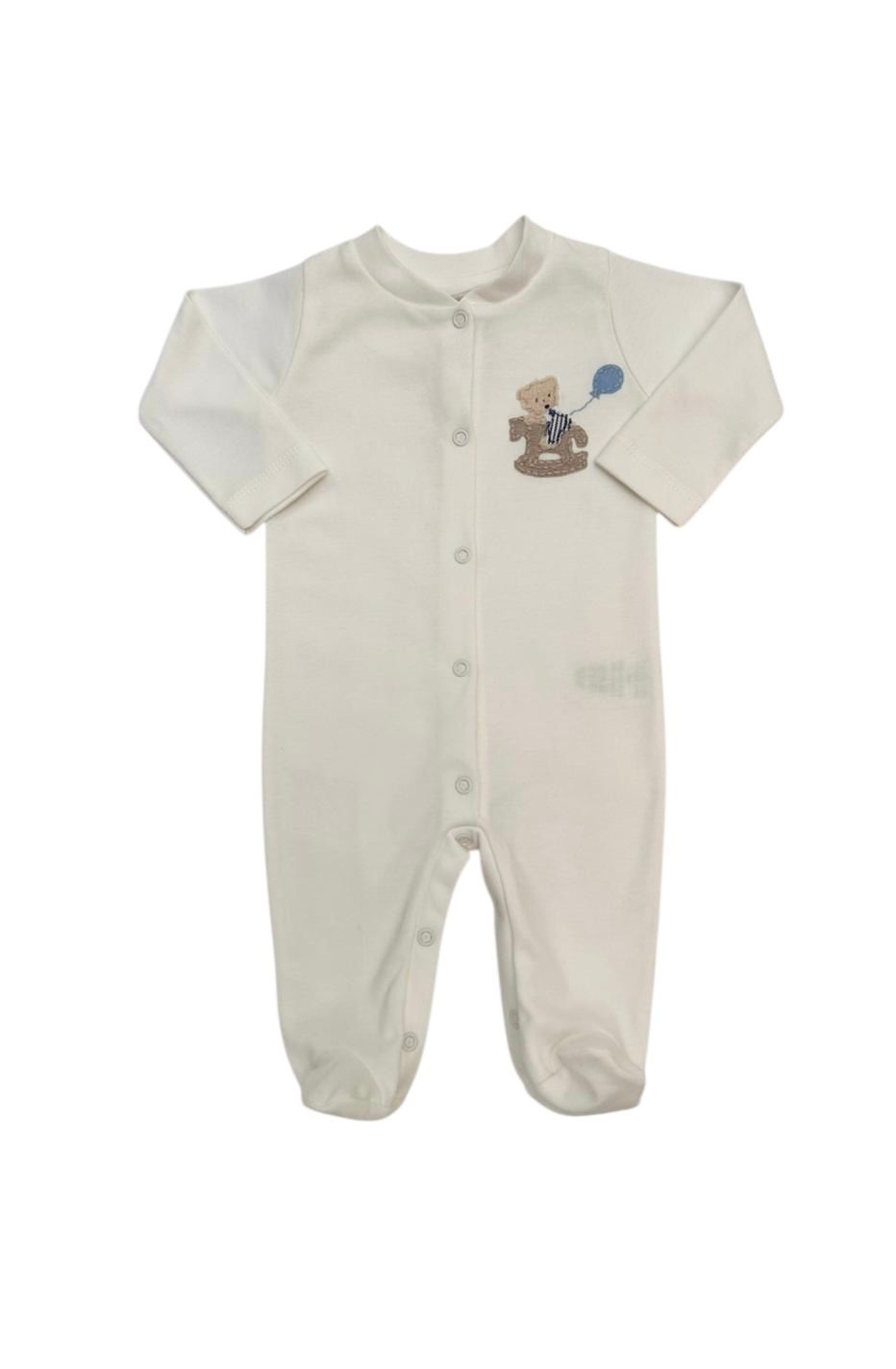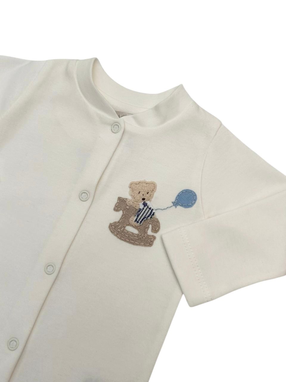 Macacão básico com bordado de urso e cavalo, possui botões na frente e entrepernas.