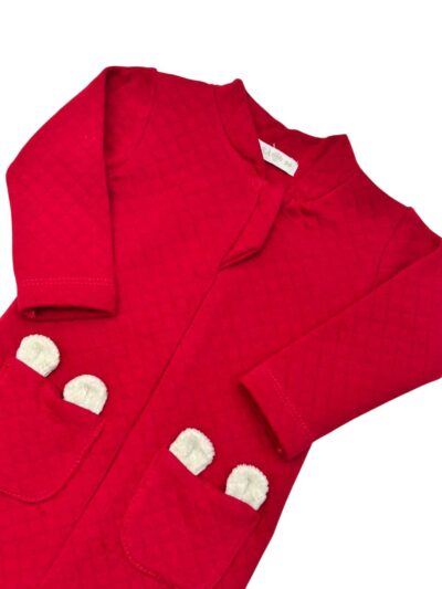 Macacão Matelasse, possui bolsos na frente com detalhe de orelha de urso, possui zíper na frente para fechamento e botões de pressão entrepernas.