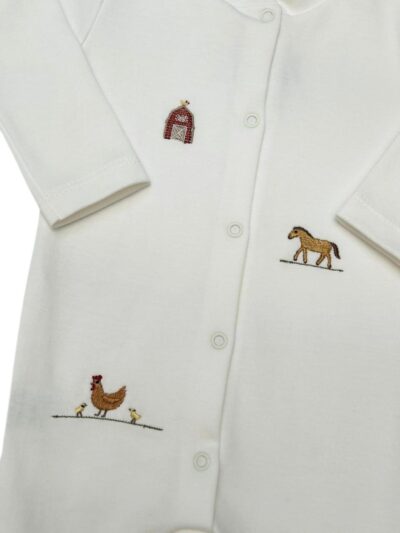 Macacão básico com bordado de celeiro, vaca e cavalo. Possui botões na frente e entrepernas.