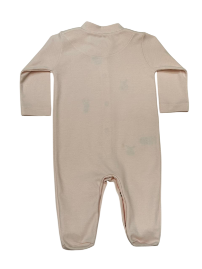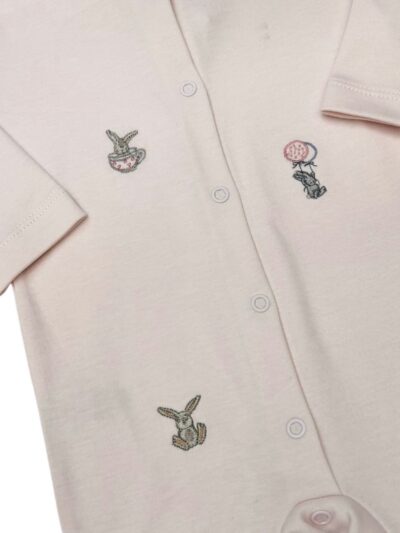 Macacão básico com bordado de coelhos e balão. Possui botões na frente e entrepernas.