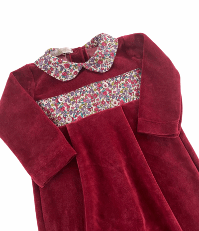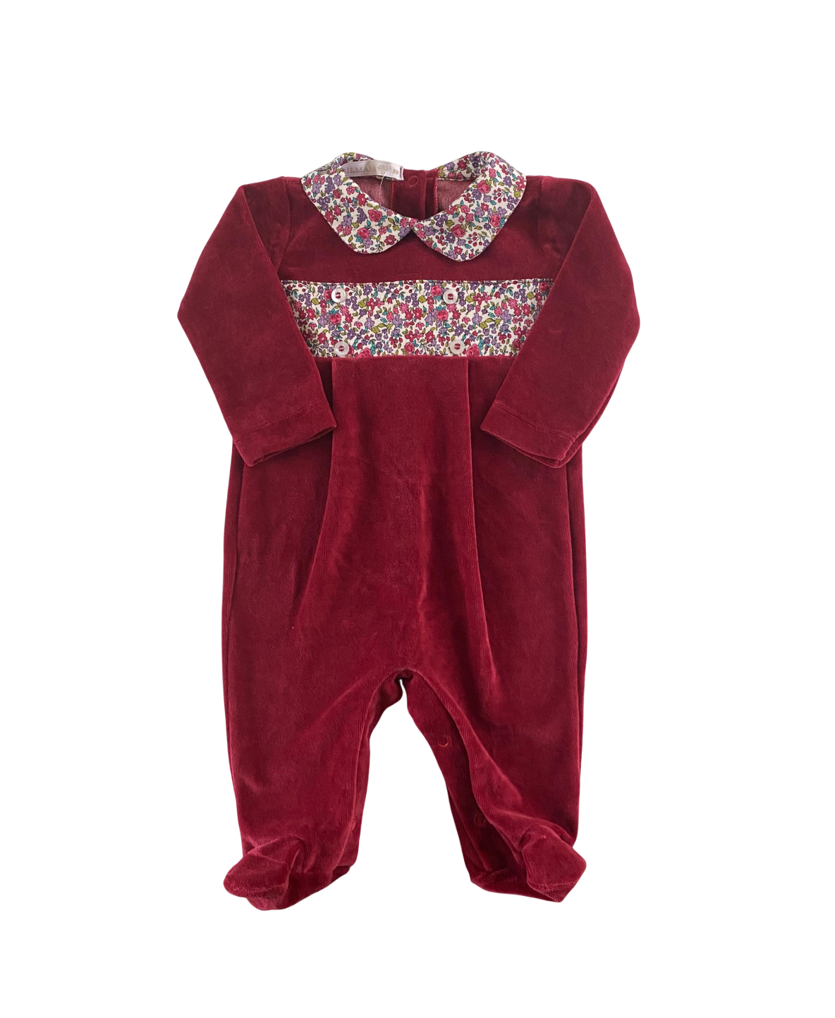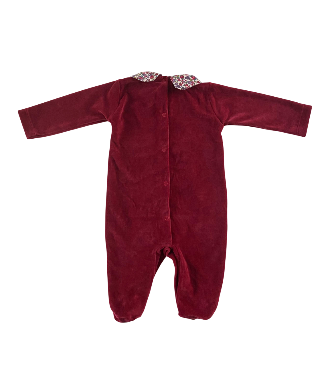 Macacão de plush com gola redonda e faixa horizontal floral. Botões de pressão para fecho na parte de trás e entrepernas.