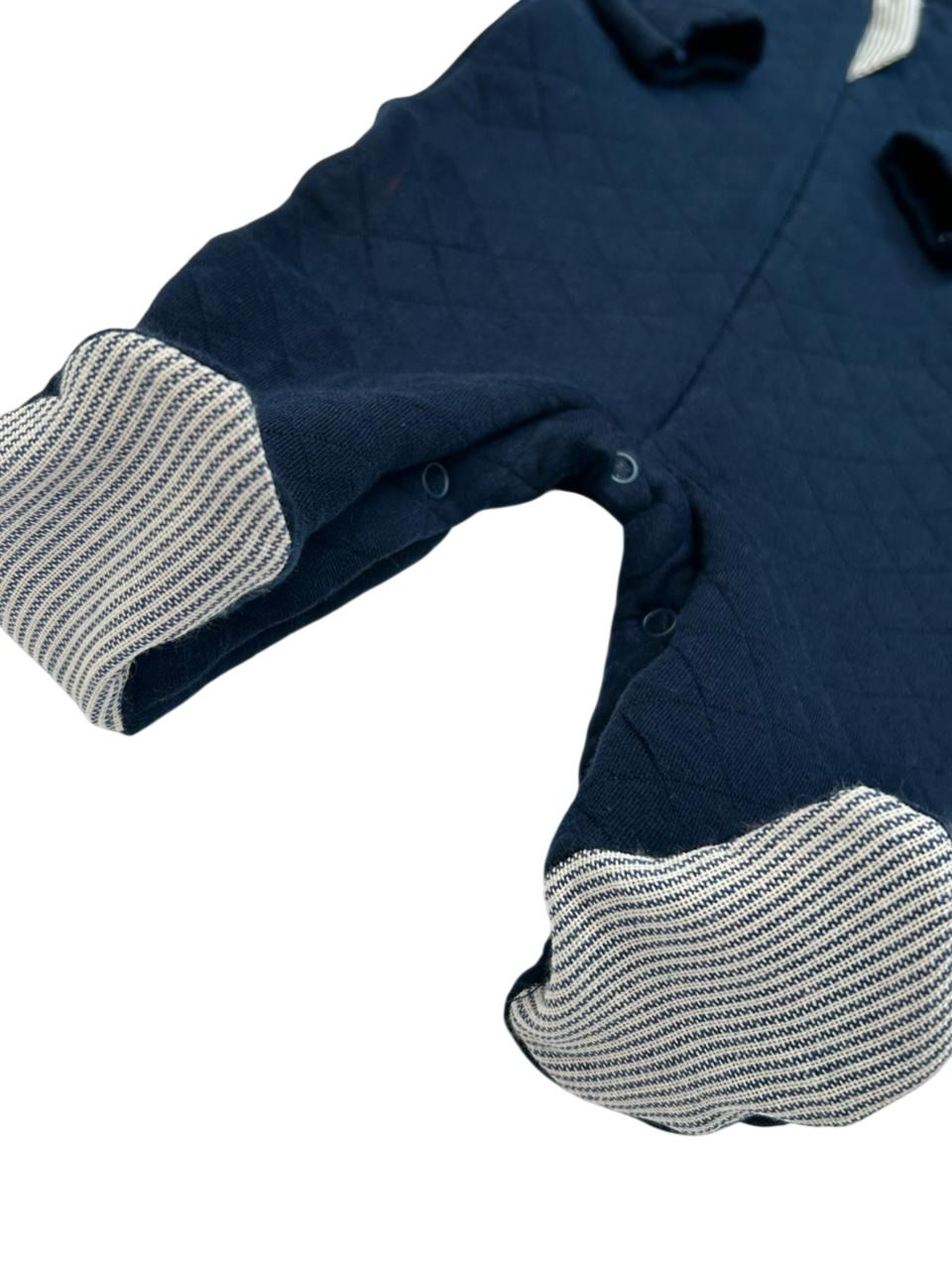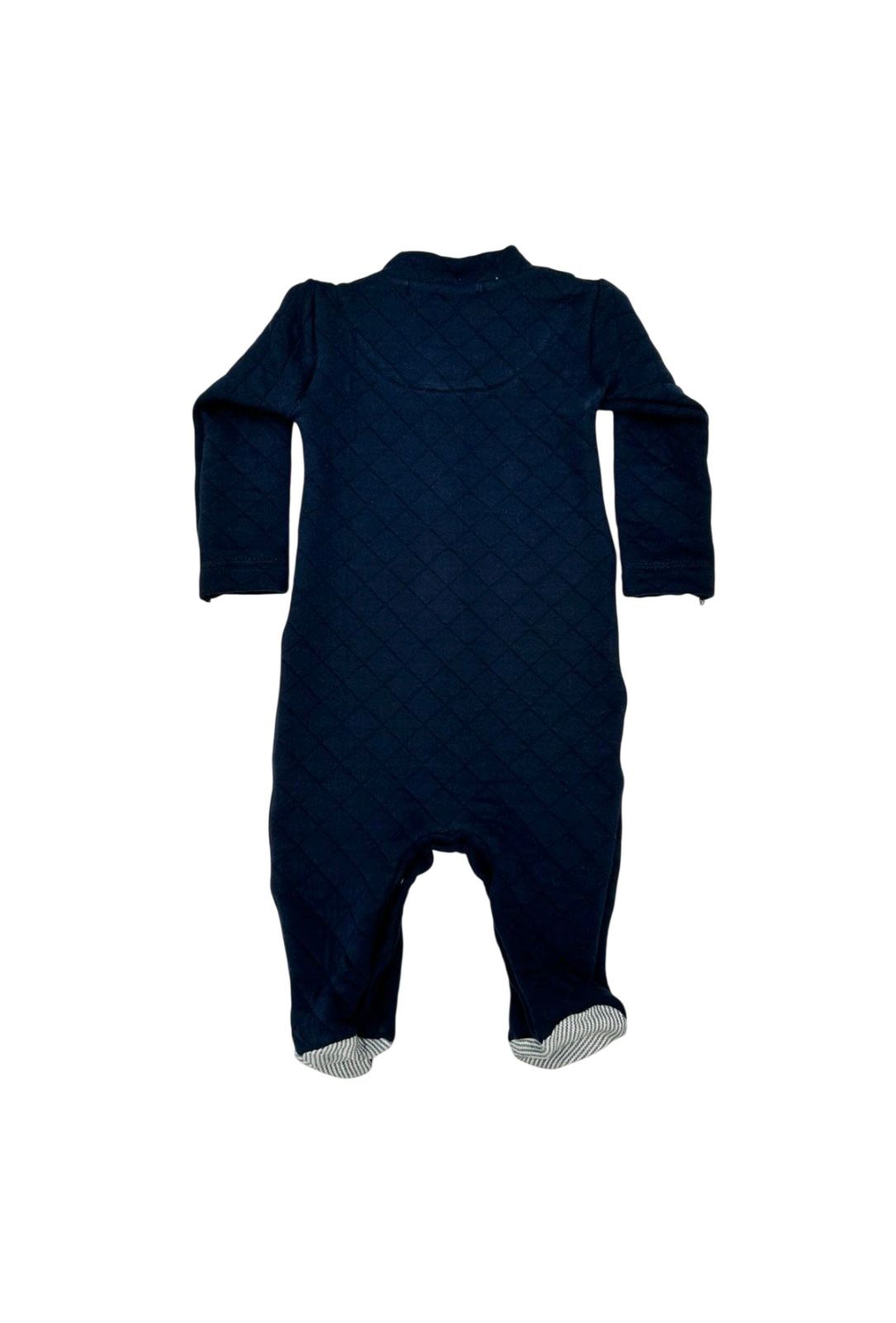 Macacão Matelasse com detalhe de tecido listrado no zíper e nos pés, possui zíper na frente para fechamento.