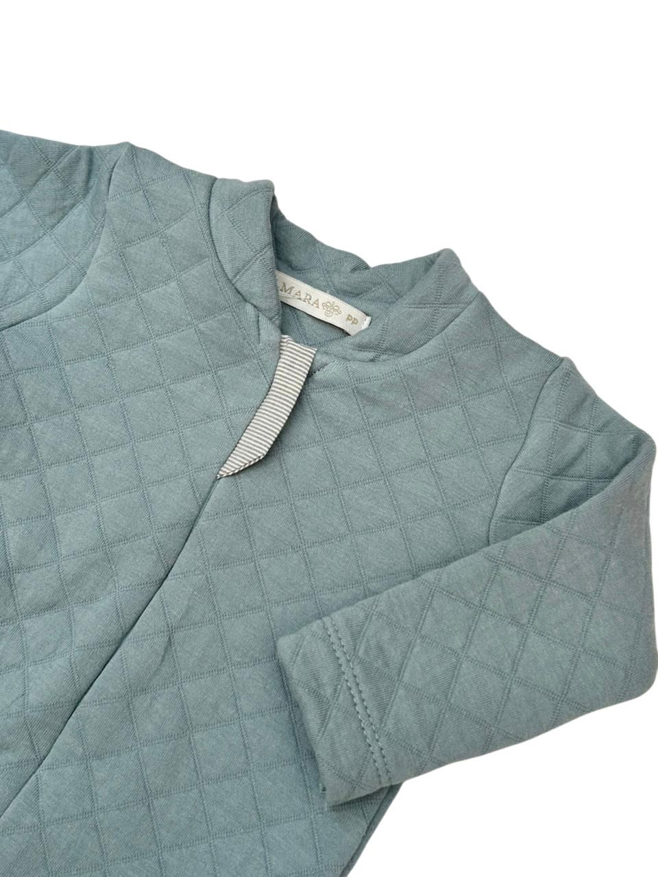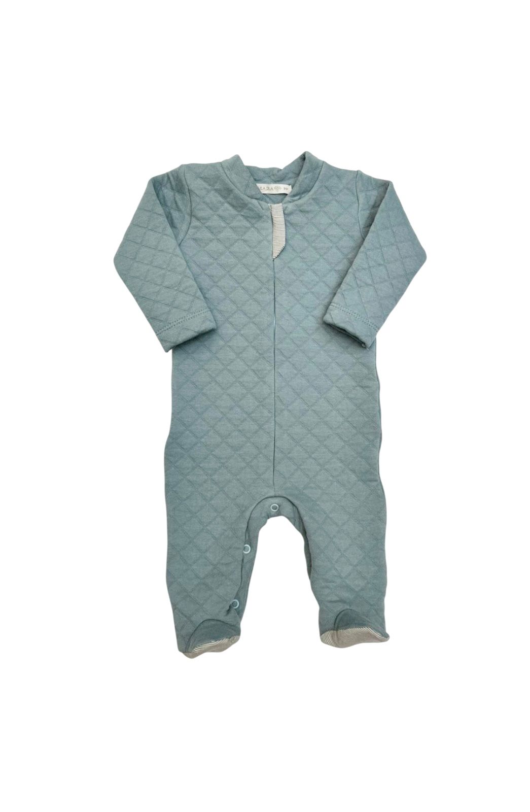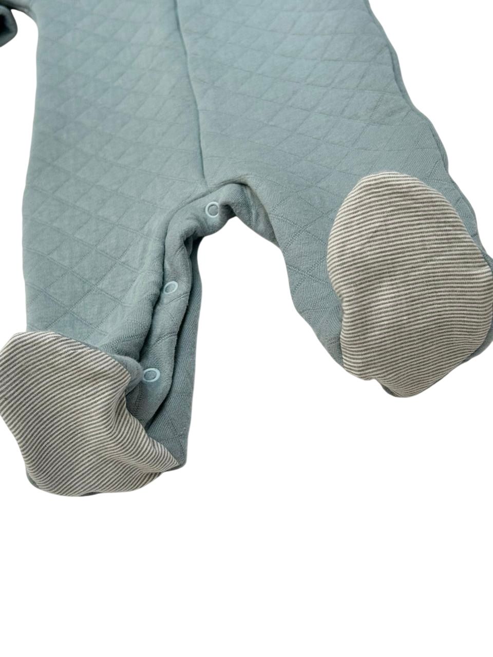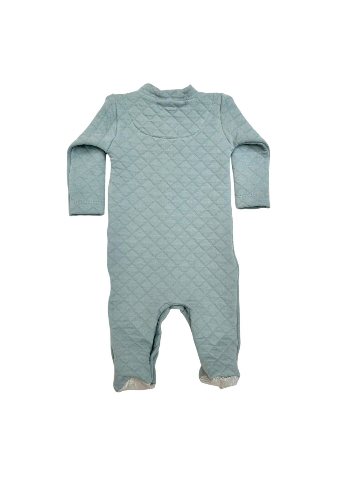 Macacão Matelasse com detalhe de tecido listrado no zíper e nos pés, possui zíper na frente para fechamento.