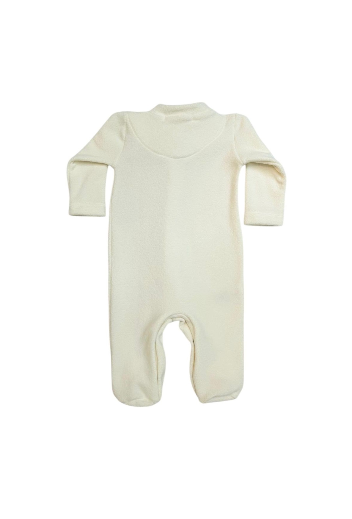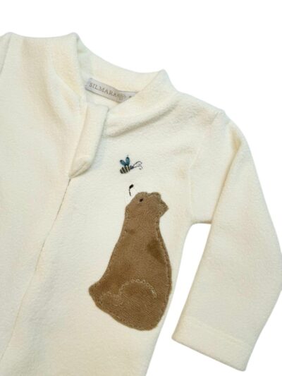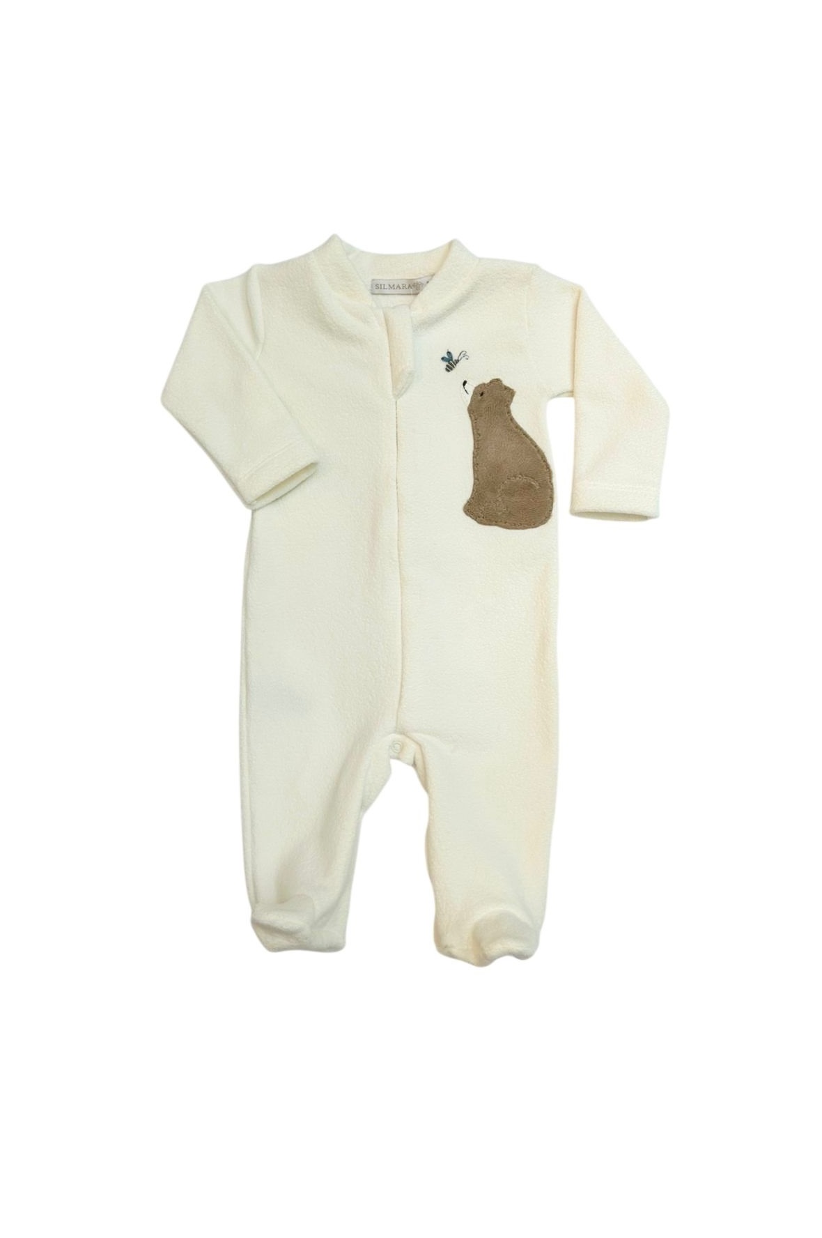 Macacão de Microsoft, com aplicação de urso e abelha. Possui zíper na frente e botões entreperna, a partir do tamanho GG não possui pé.