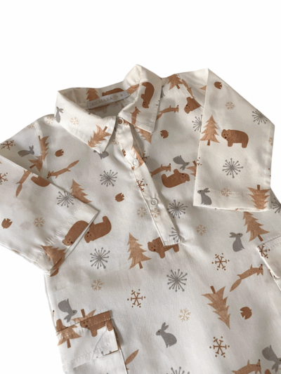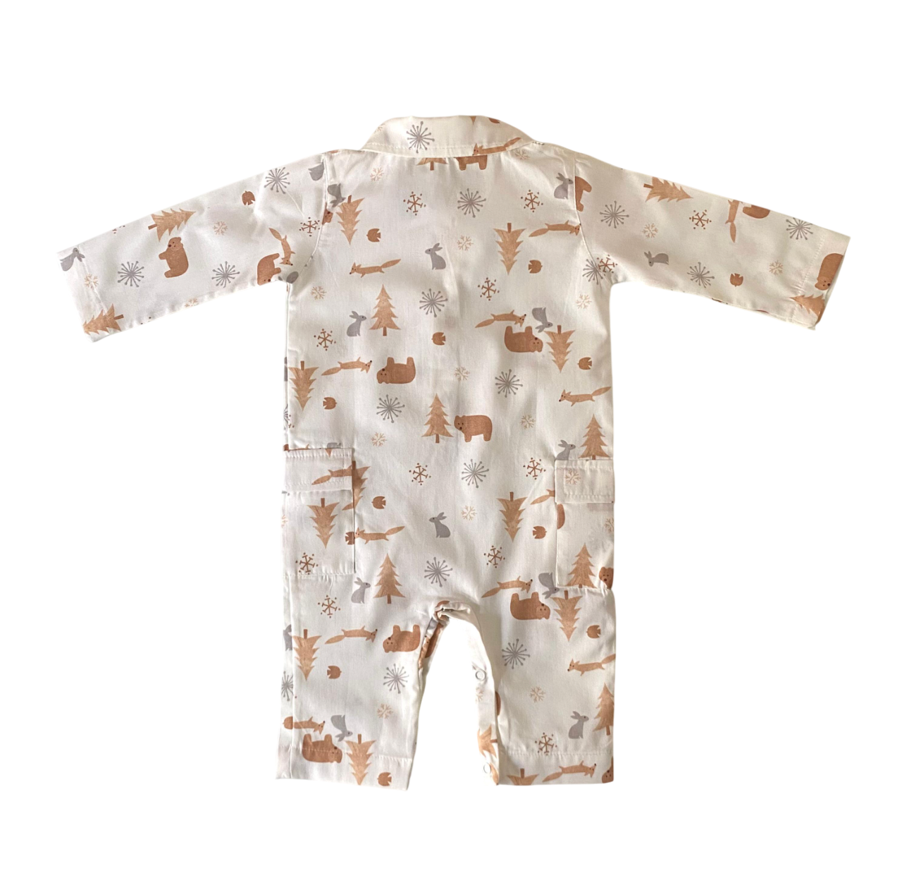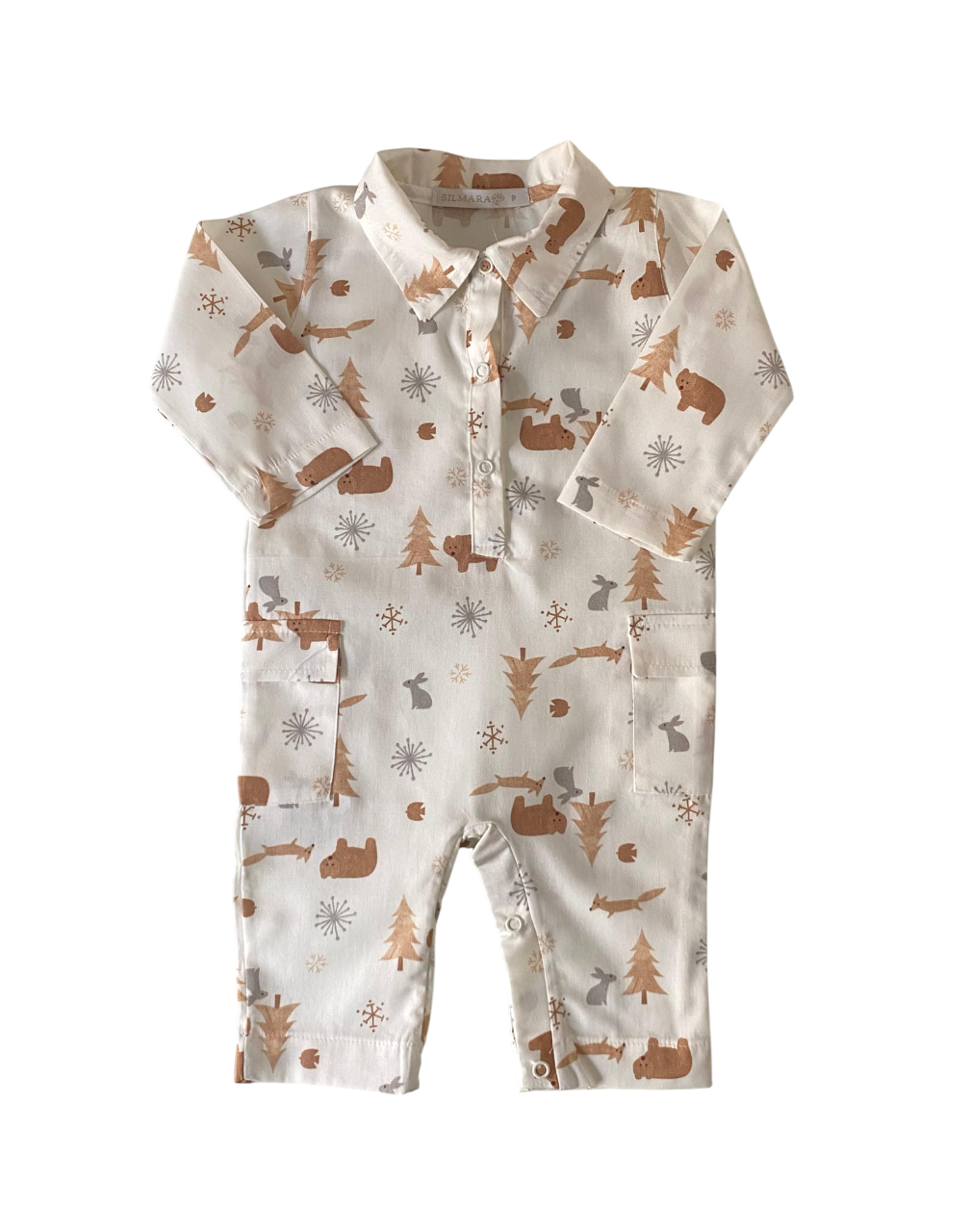 Macacão manga longa com gola bico, botões de pressão para fecho e bolsos laterais. 100% algodão.