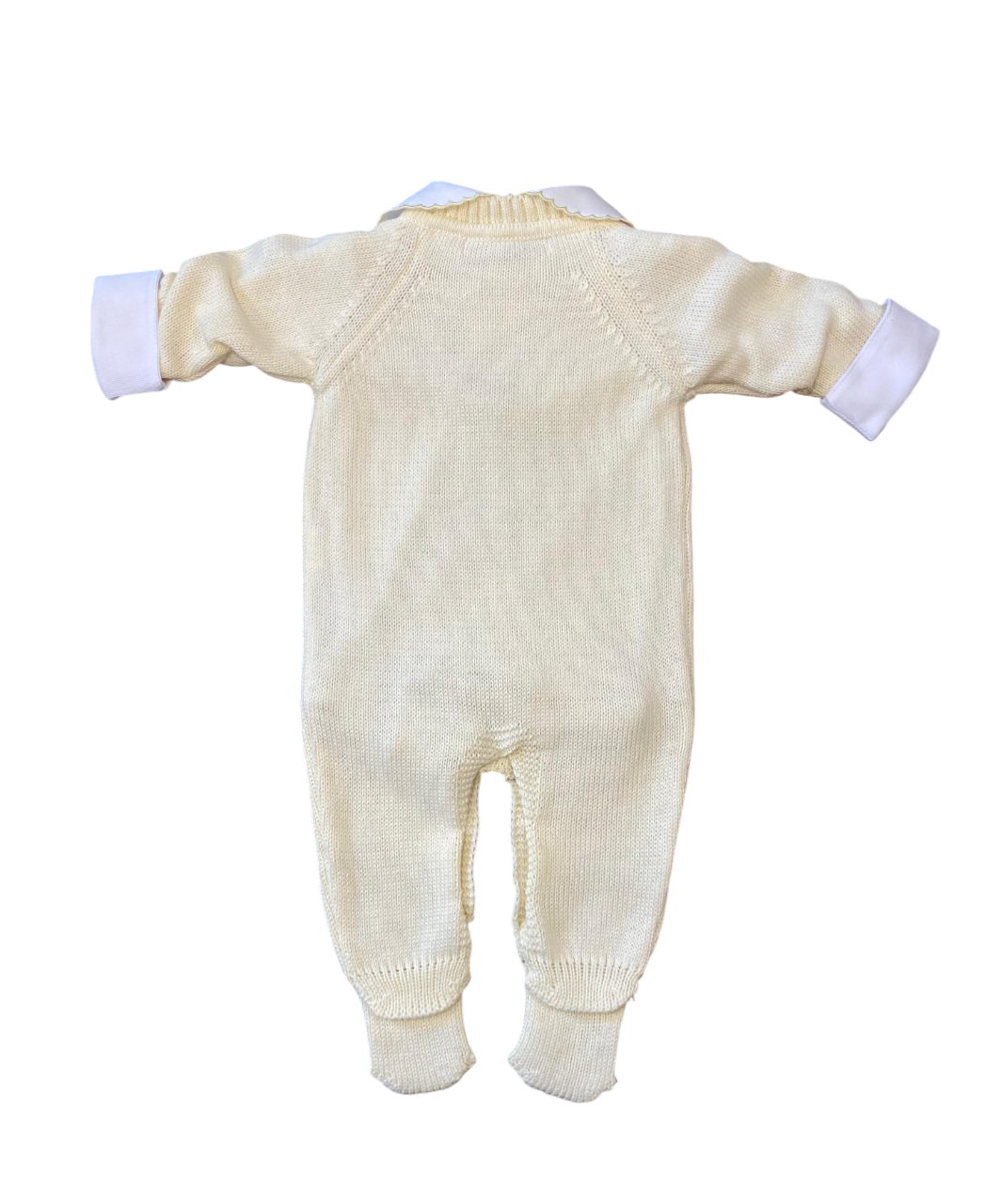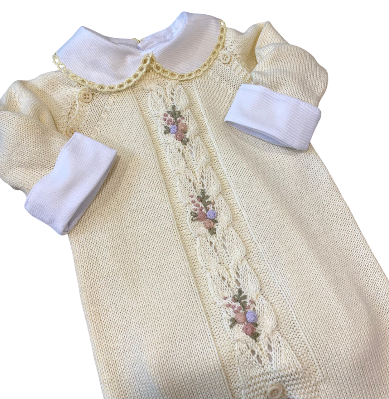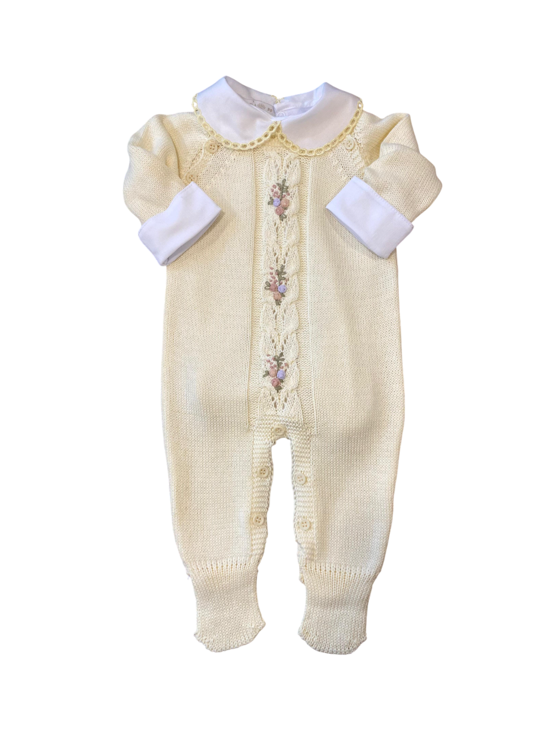 Macacão com a trama trançada e bordado rococó. 50% algodão e 50% acrílico.