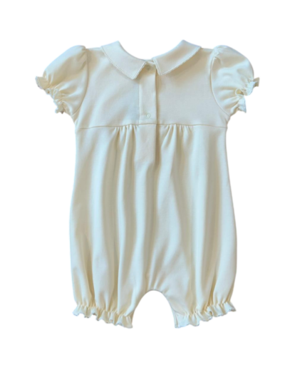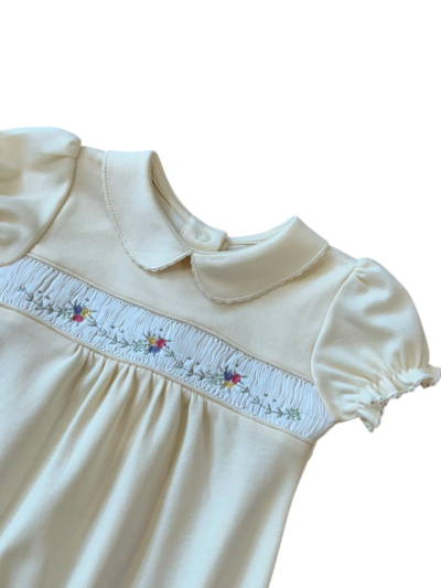 Macaquinho Pima com casinha de abelha e bordado de ramos de flores, com gola redonda, lastex na manga e na perna, possui botões de pressão entrepernas e nas costas.