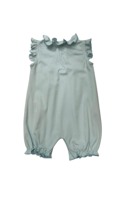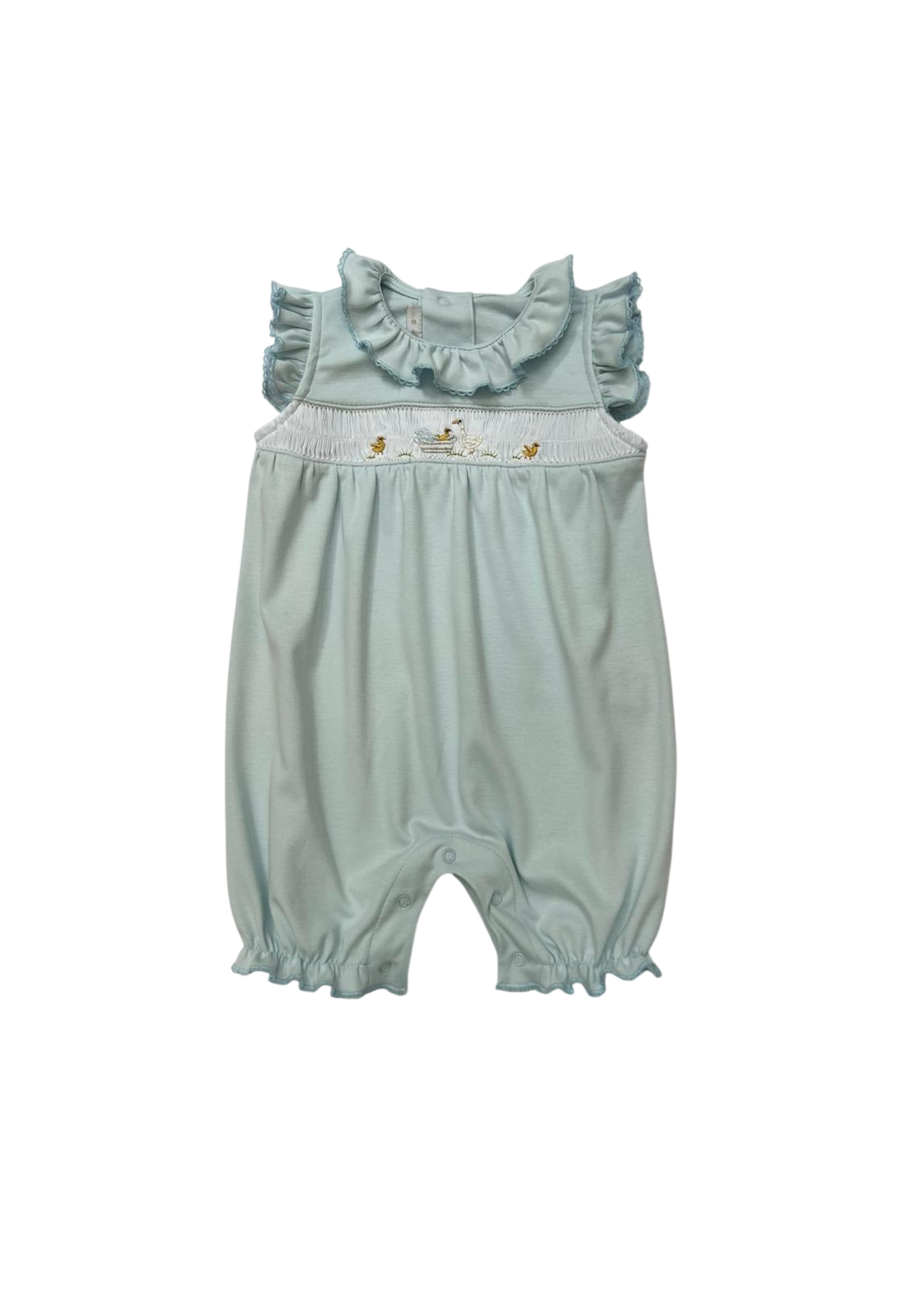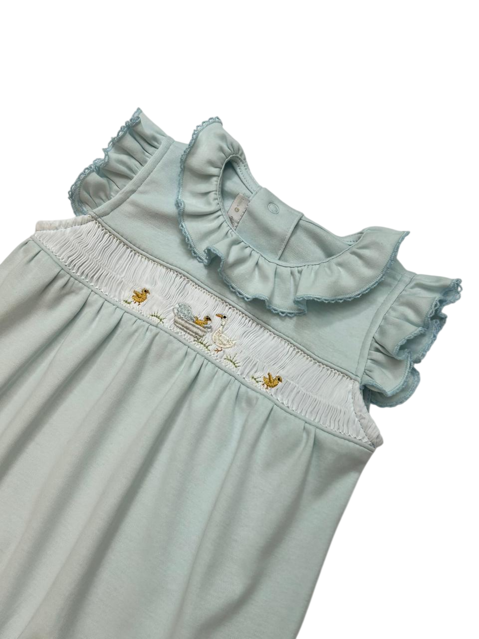 Macaquinho Pima com casinha de abelha e bordado de patos, com gola babado, lastex na perna, possui botões de pressão entrepernas e nas costas.