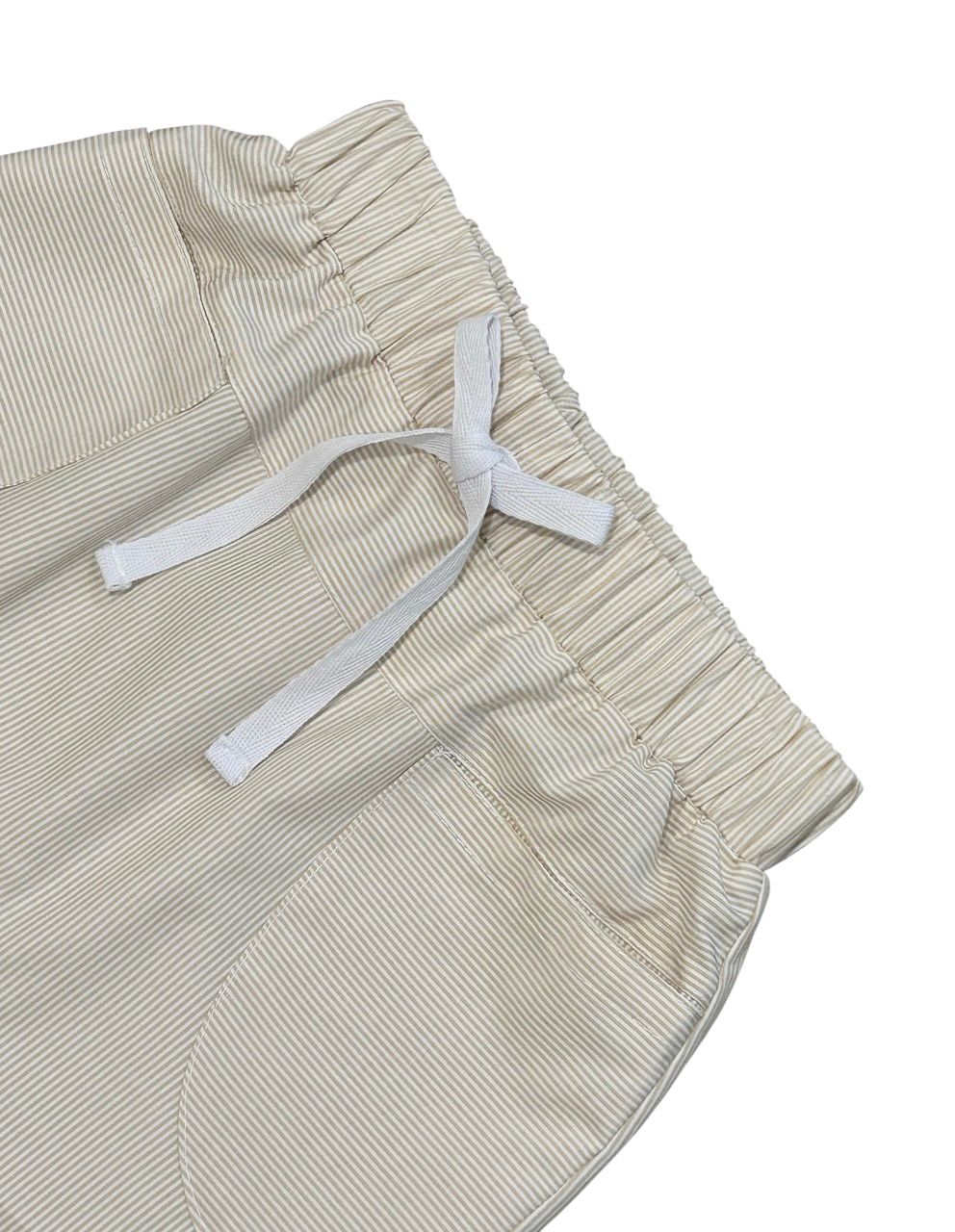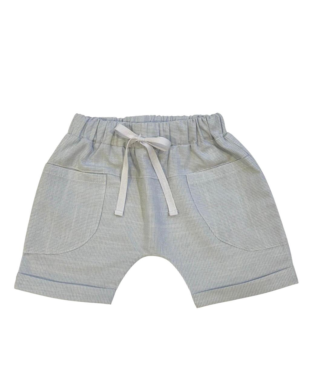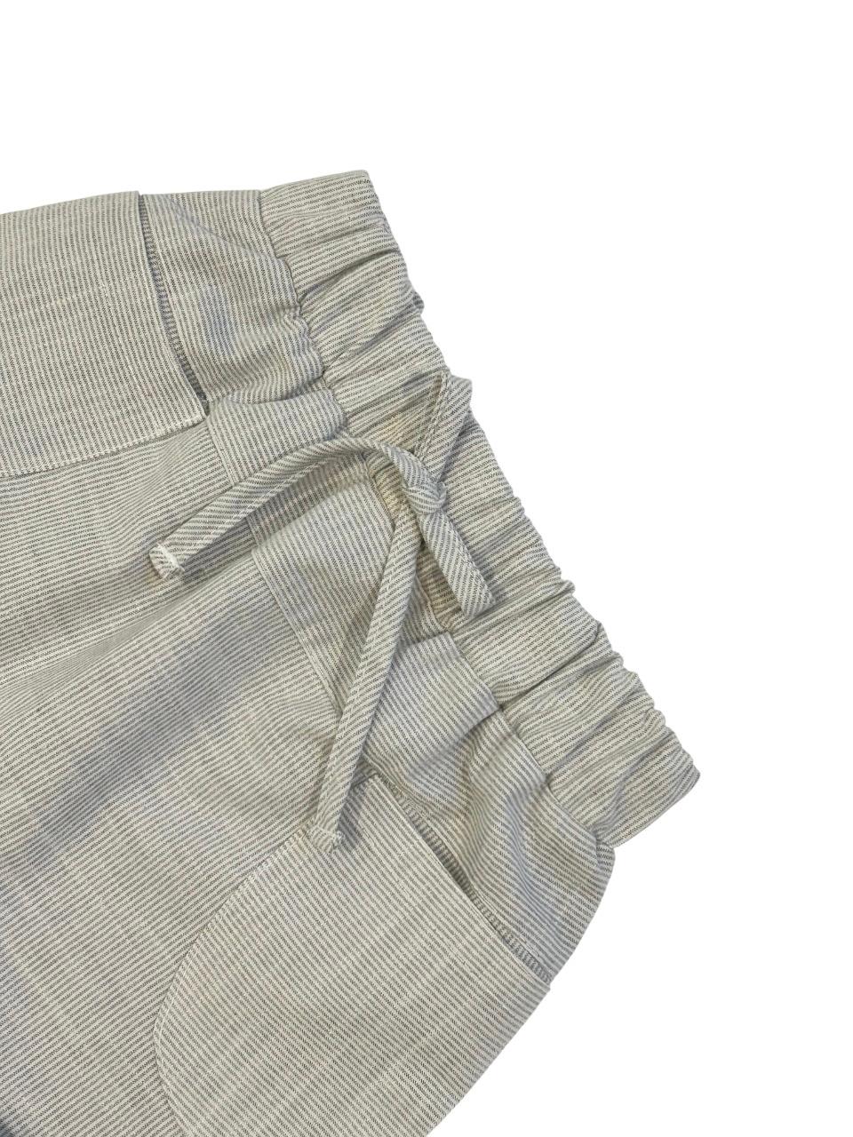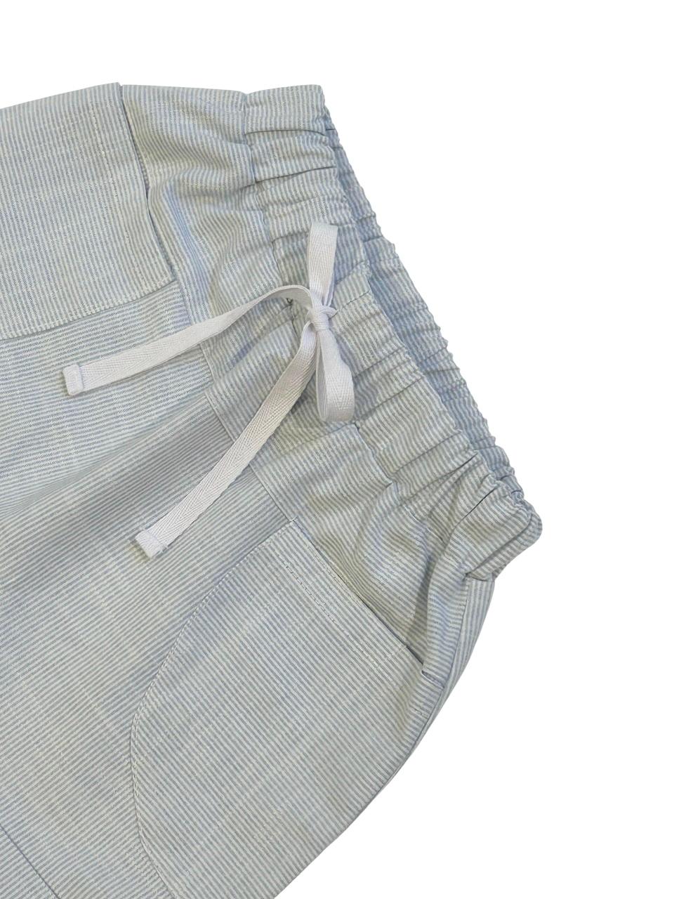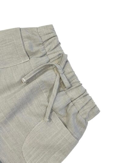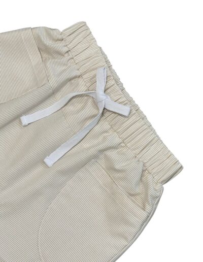 Shorts saruel em tecido listrado, com bolsos na frente, elástico na cintura e detalhe para amarração na frente.