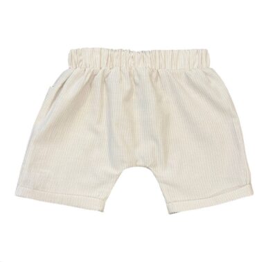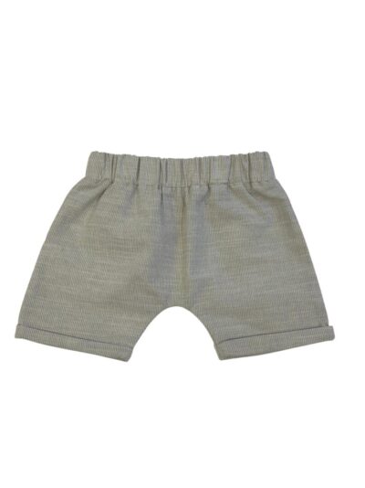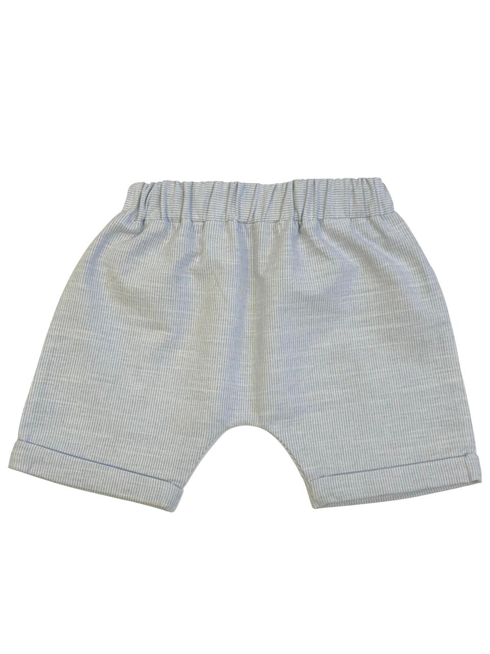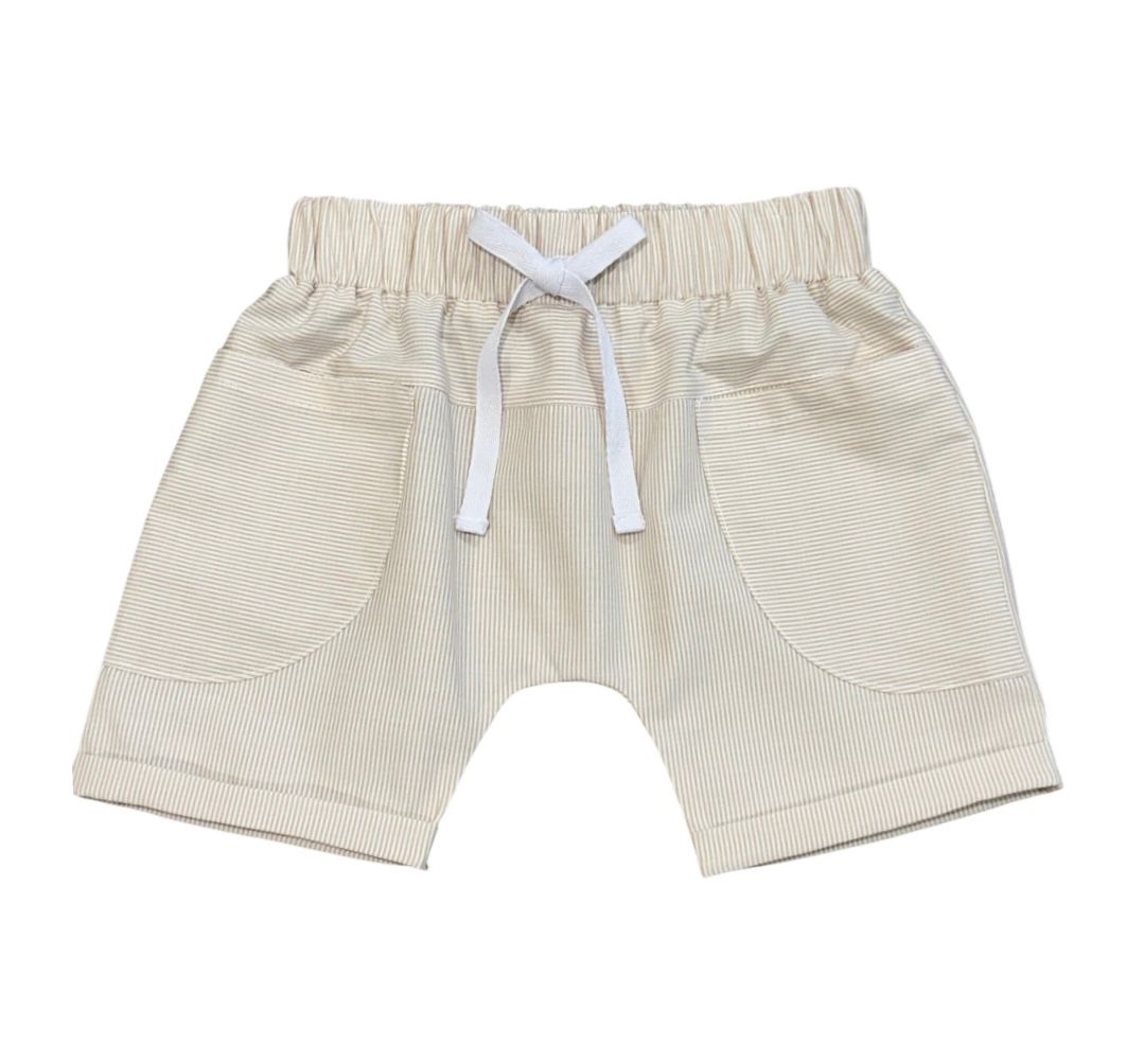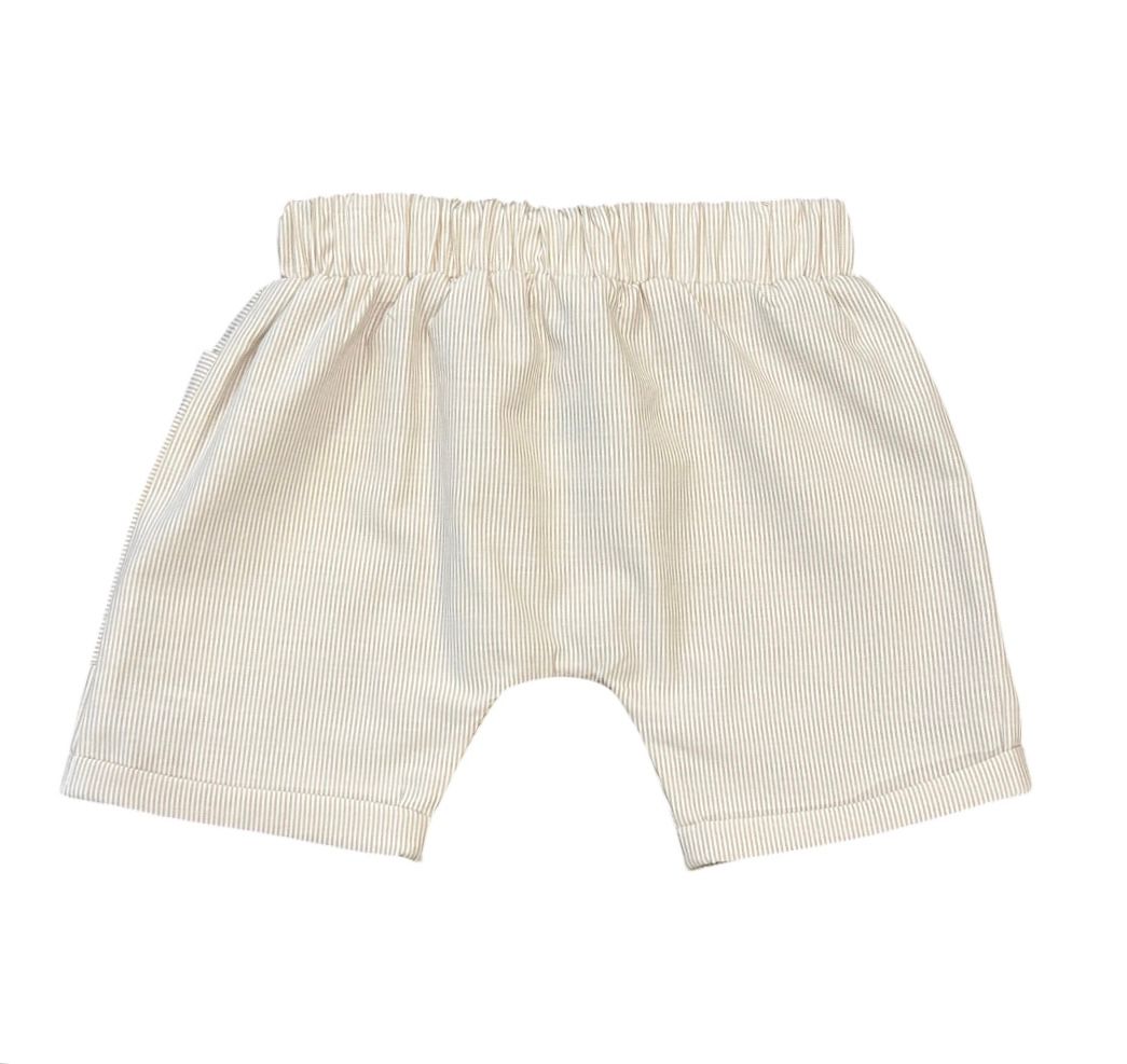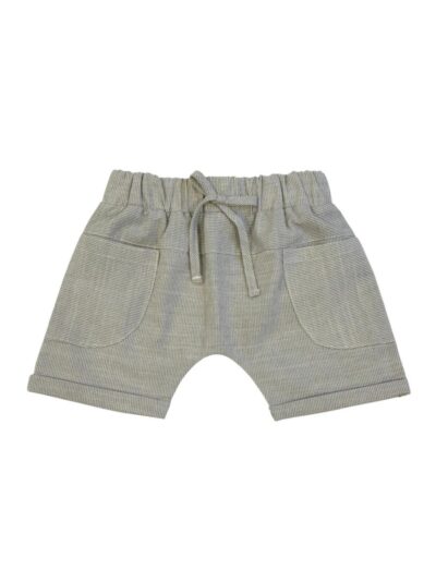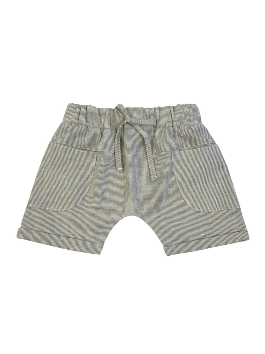 Shorts saruel em tecido listrado, com bolsos na frente, elástico na cintura e detalhe para amarração na frente.