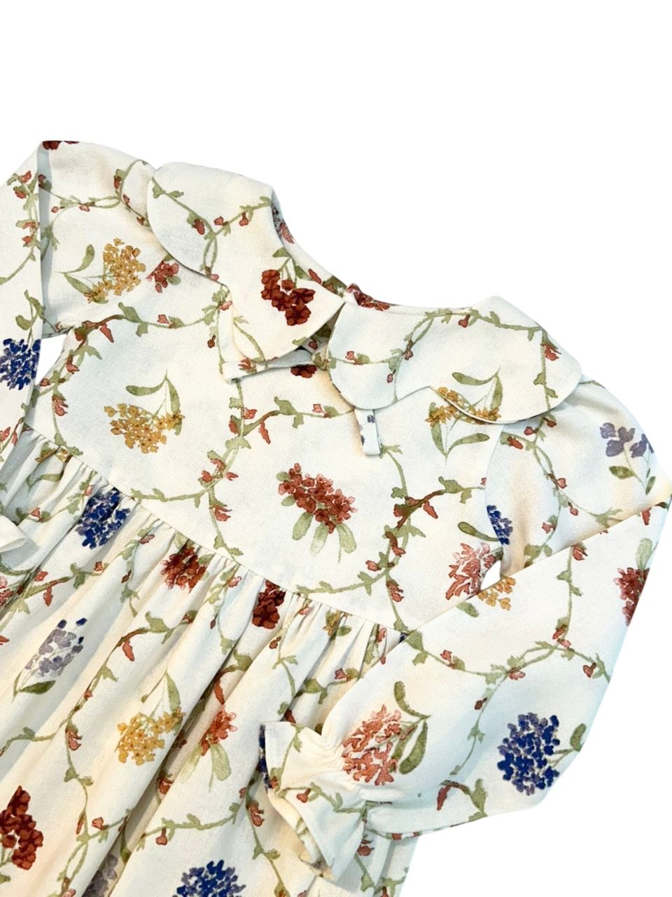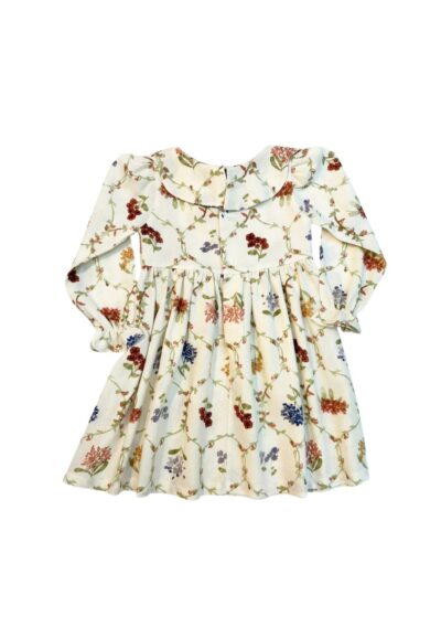 Vestido manga longa com lastex no punho, estampa floral, possui gola babado e botões nas costas para fechamento.
