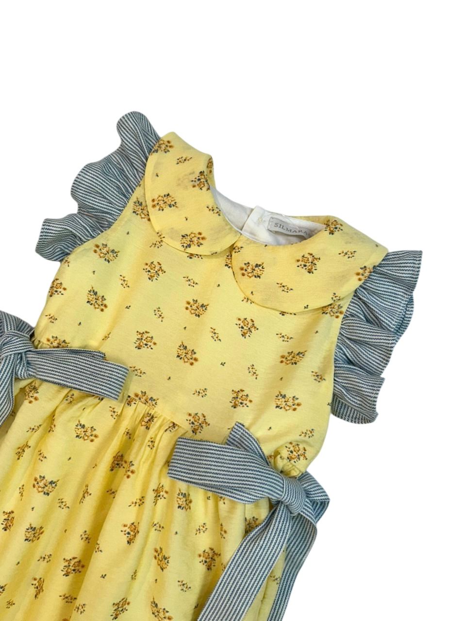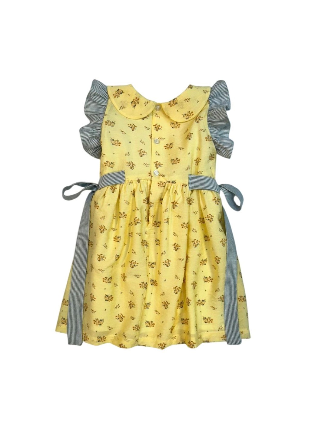 Vestido Aurora possui gola redonda, com manga babado, botões para fechamento nas costas e faixas para amarração na cintura.