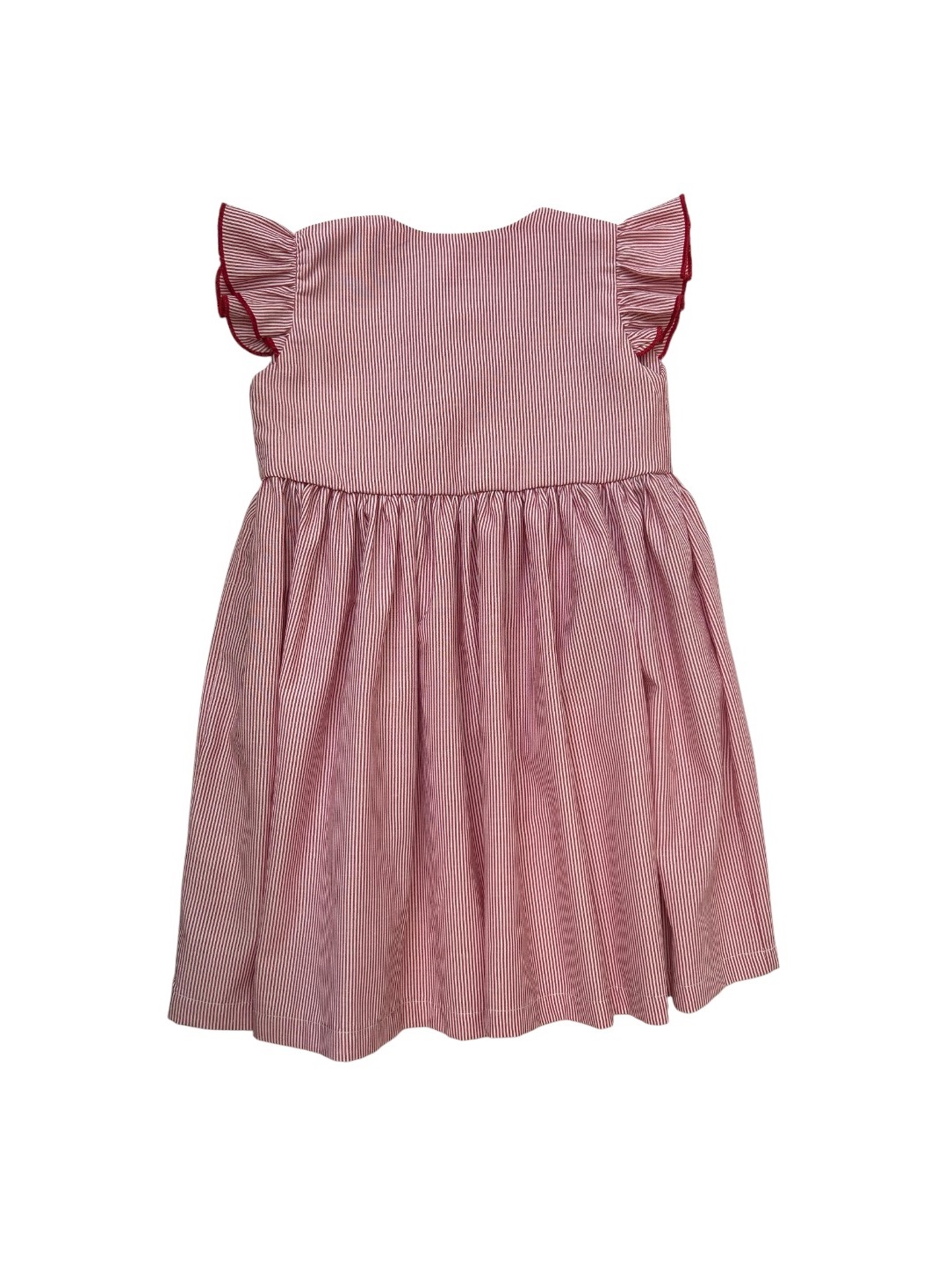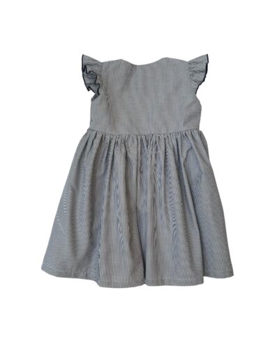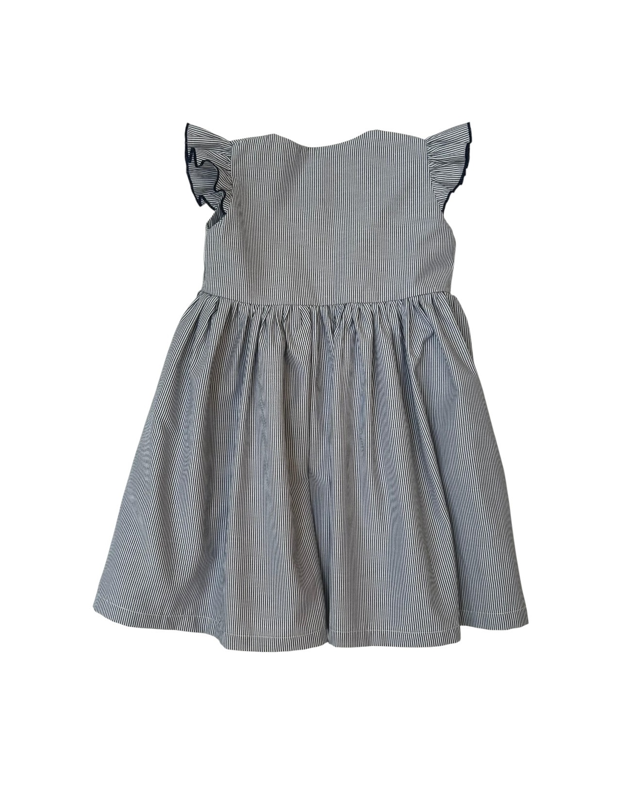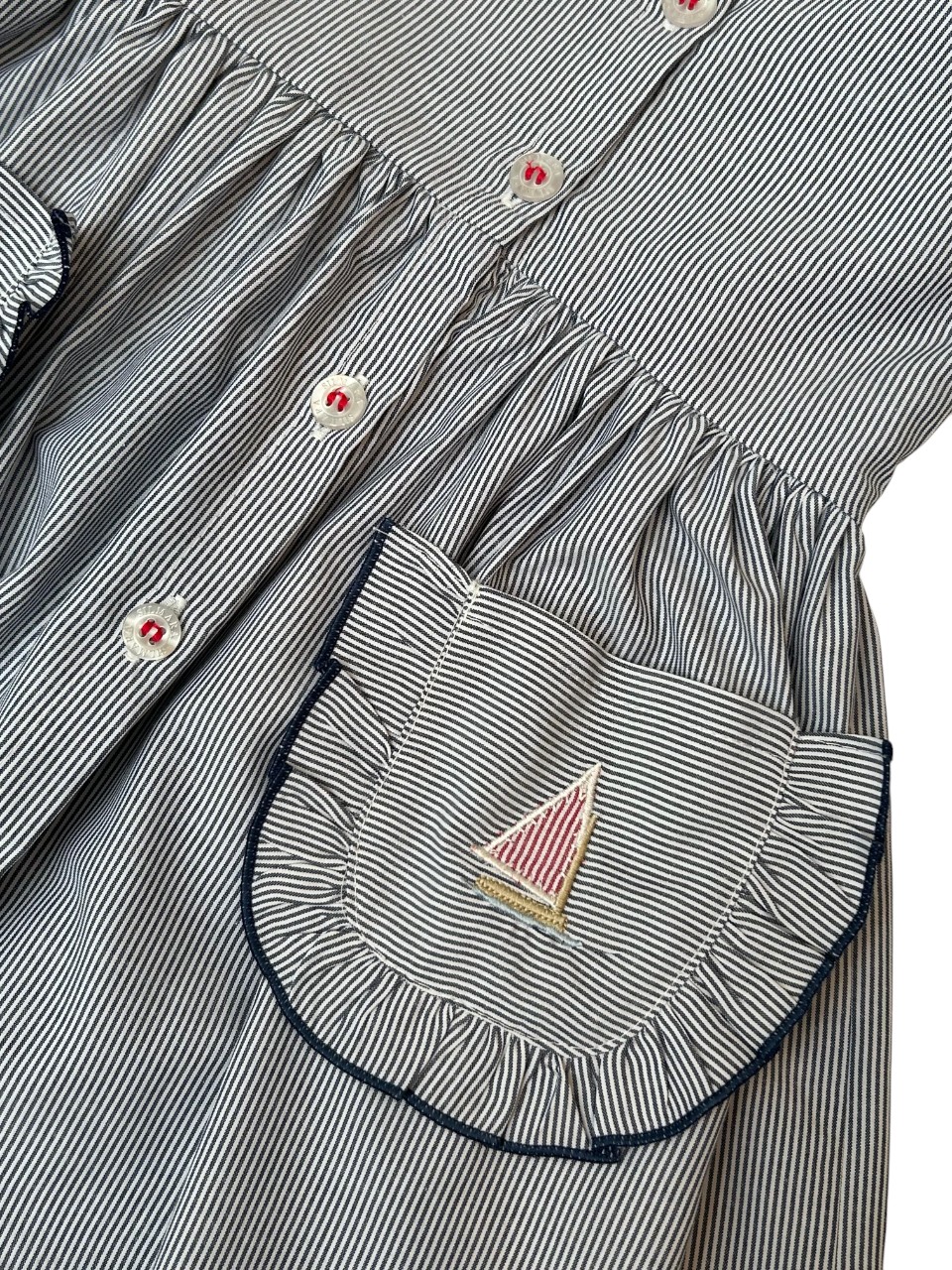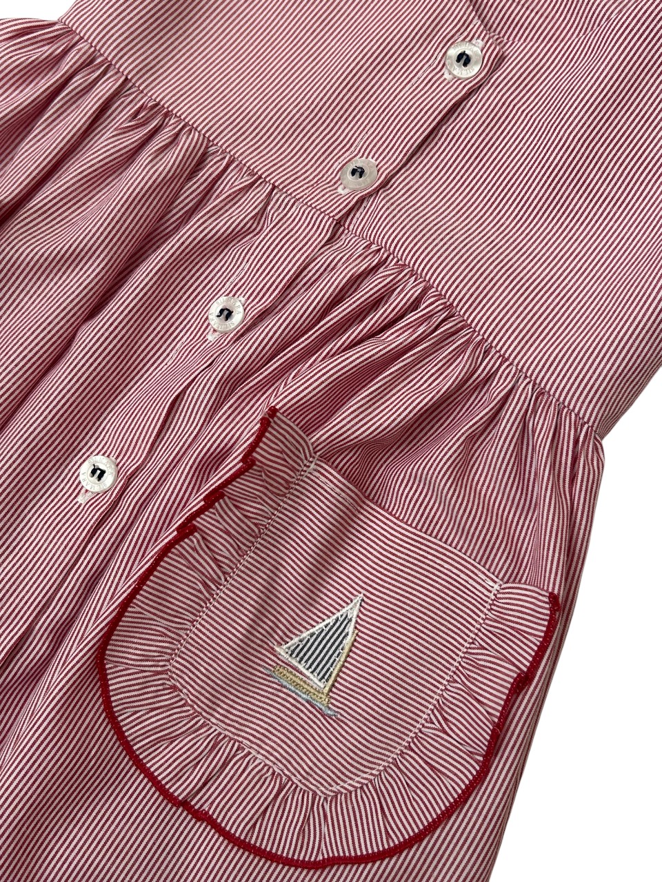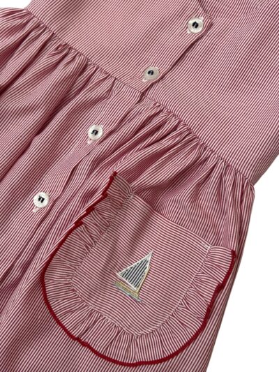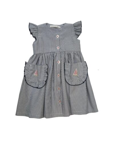 Vestido Bolsinhos possui bordado de barco nos bolsos, botões na frente e manga abinha.