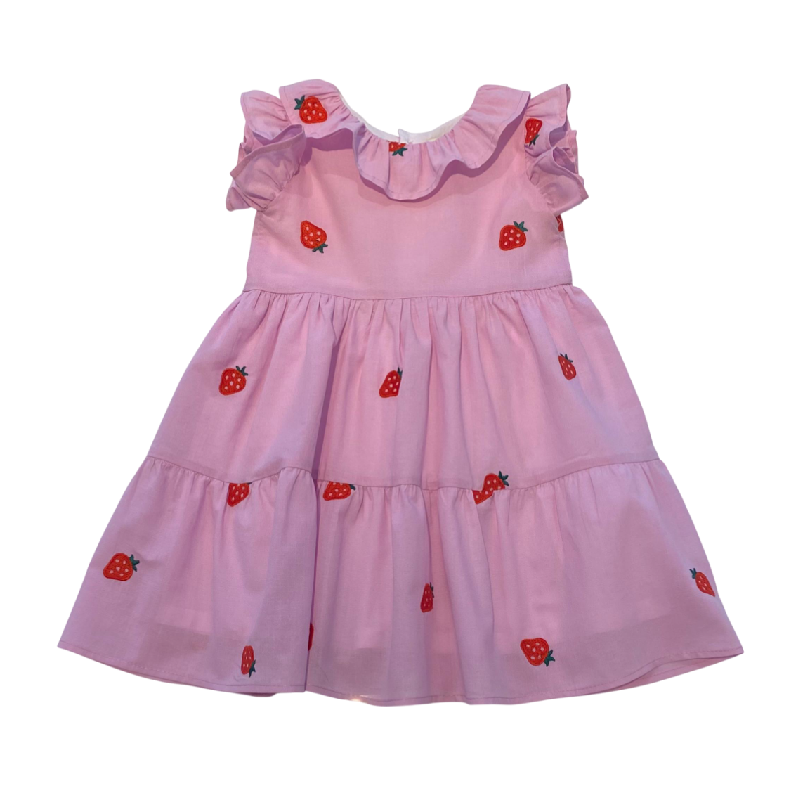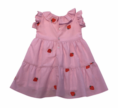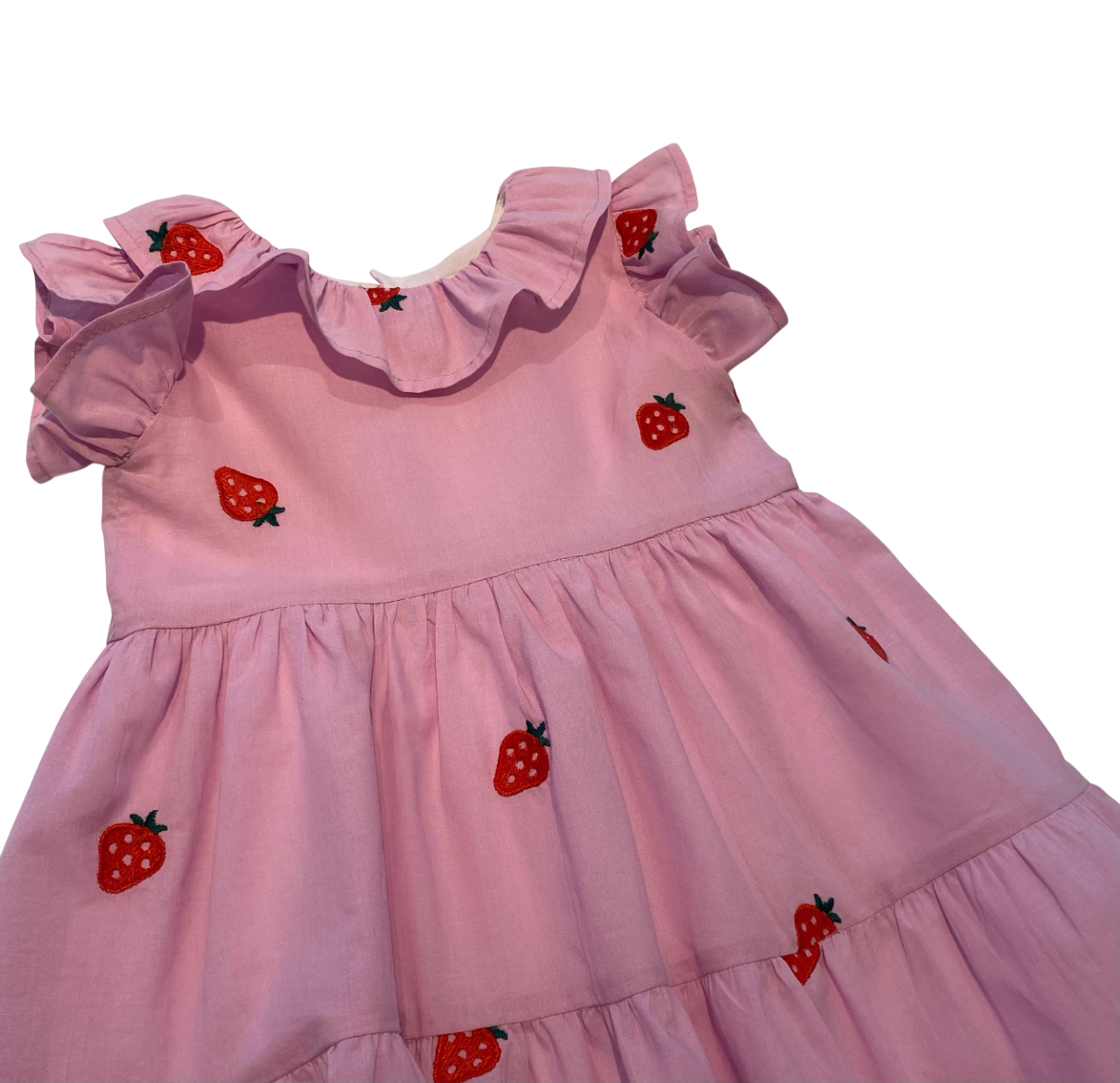 Vestido rosa com bordados de morango, gola e ombro babado com saia em duas camadas.