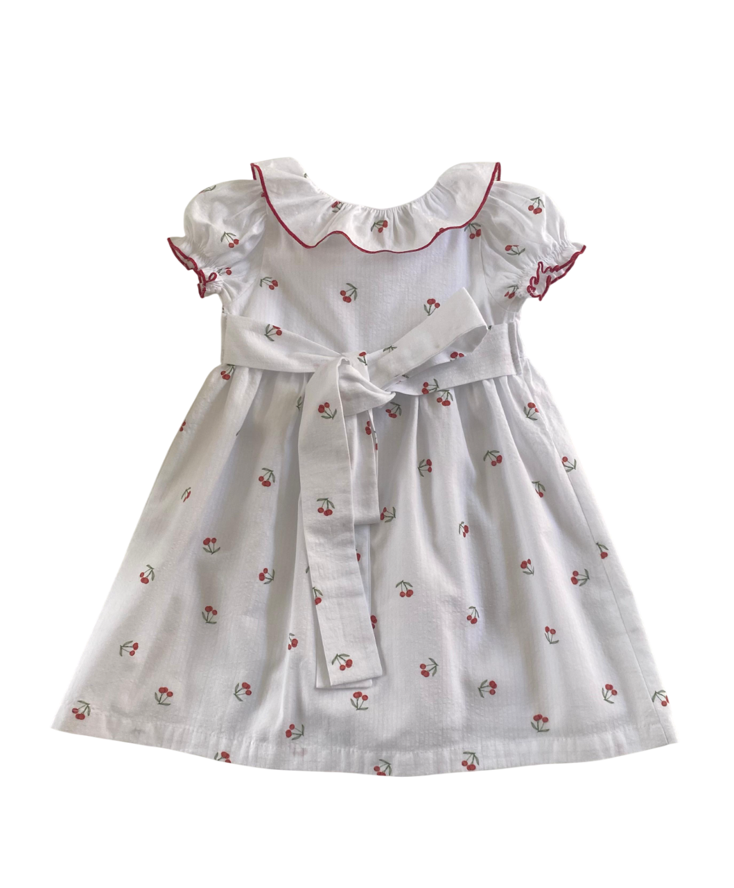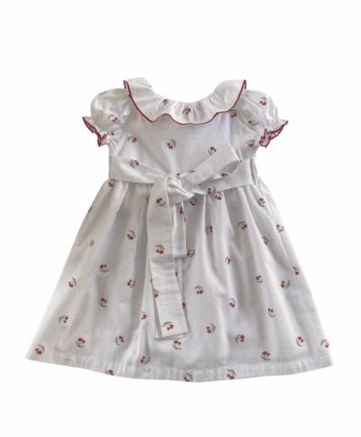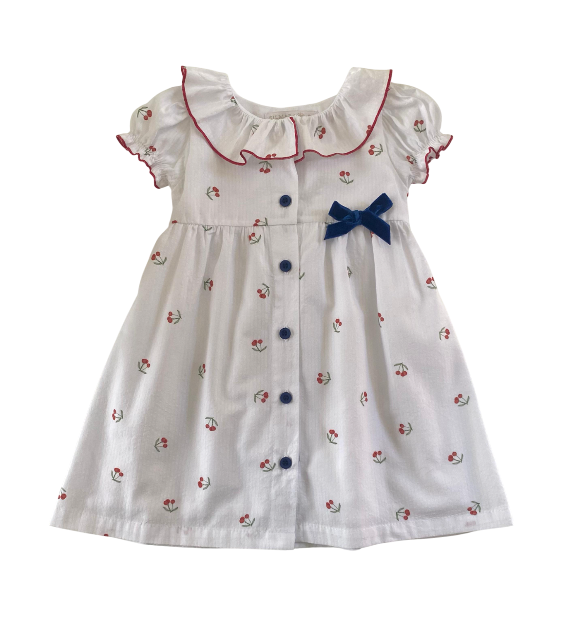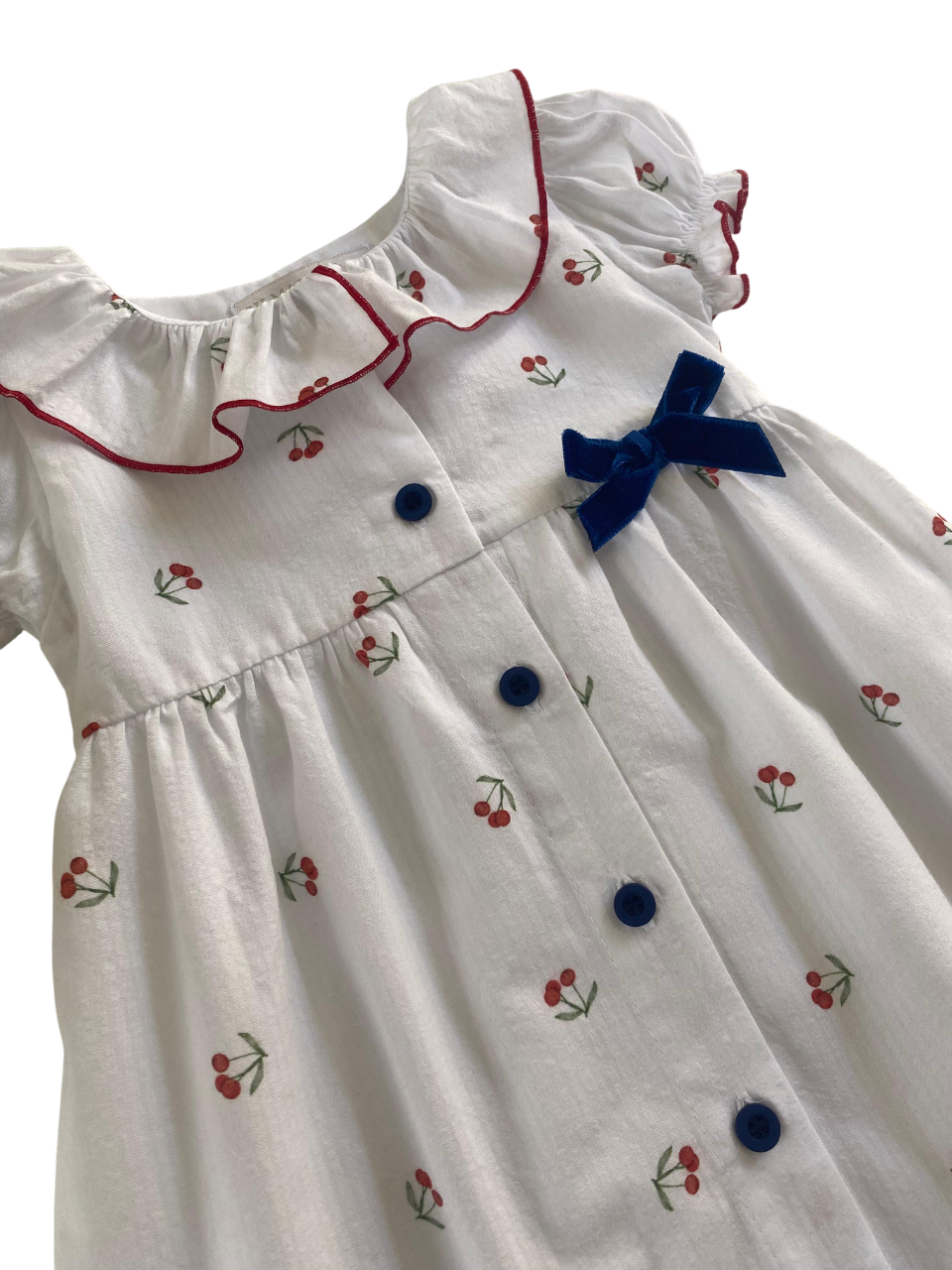 Vestido pala com gola babado, abertura em botões frontal e detalhe lacinho de veludo. 100% algodão com forro 100% viscose.
