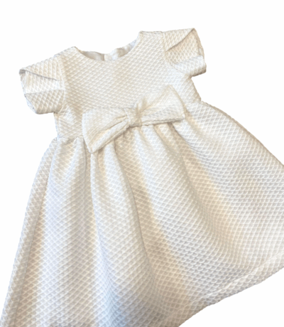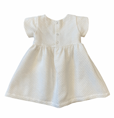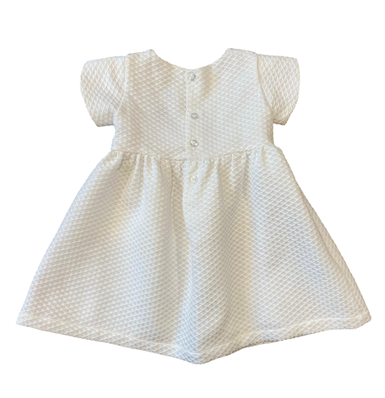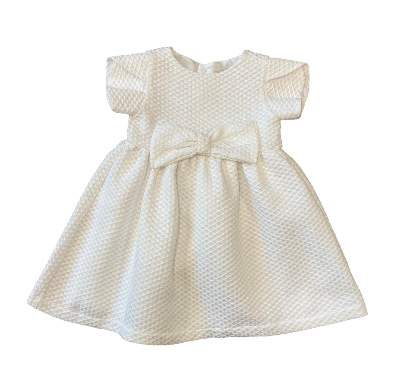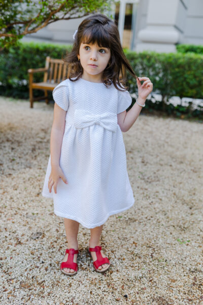 Vestido com tecido maquinetado, mangas bufantes e franzidas no ombro com detalhe laço central. 55% Poliéster e 45% algodão, com forro 100% algodão.