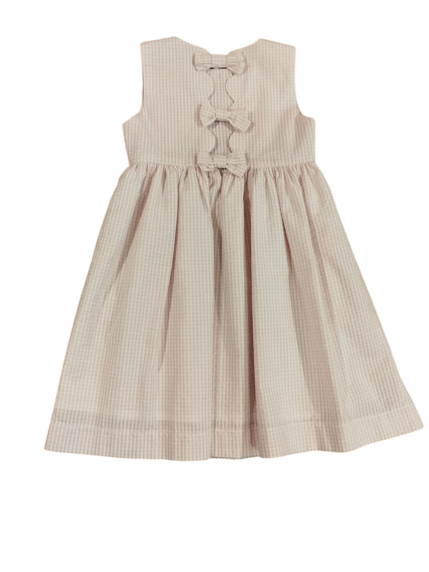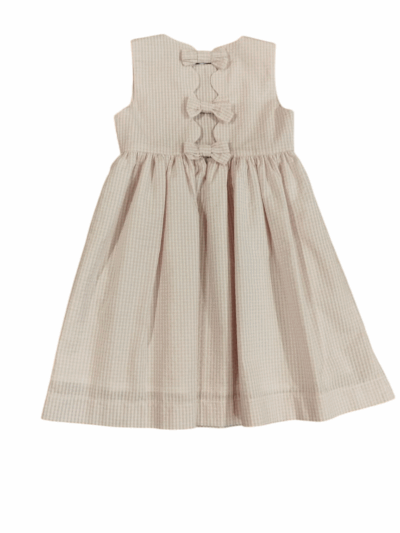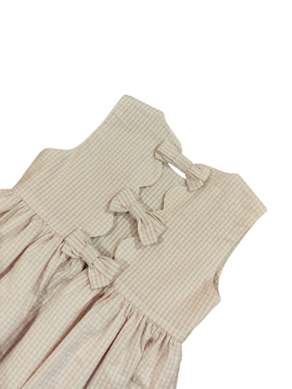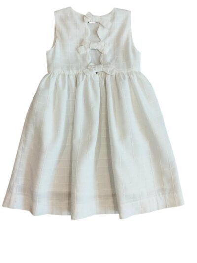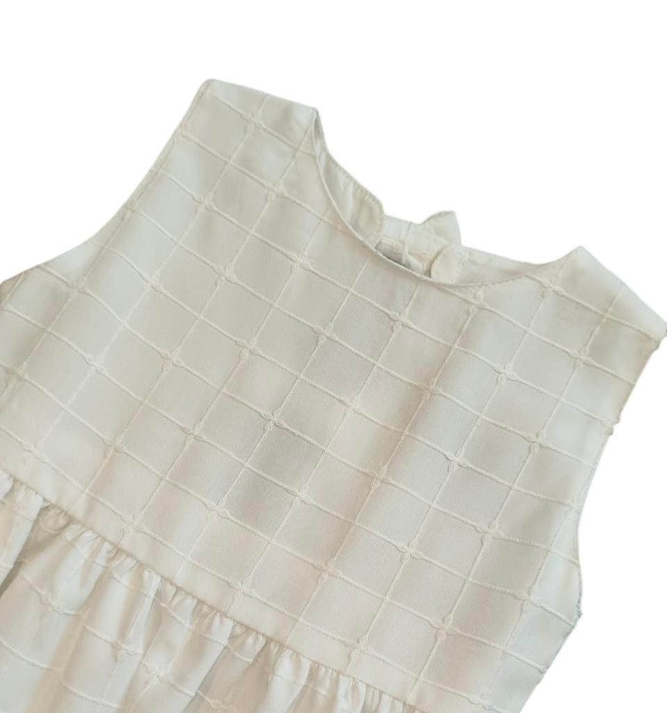 Sem manga, com abertura nas costas, detalhe em ondas, com fechamento de botões e laços.
