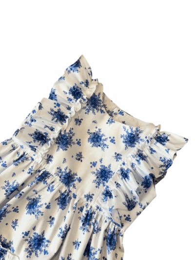 Vestido com frufru no ombro, botões nas costas e babado na saia feito em estampa floral azul.